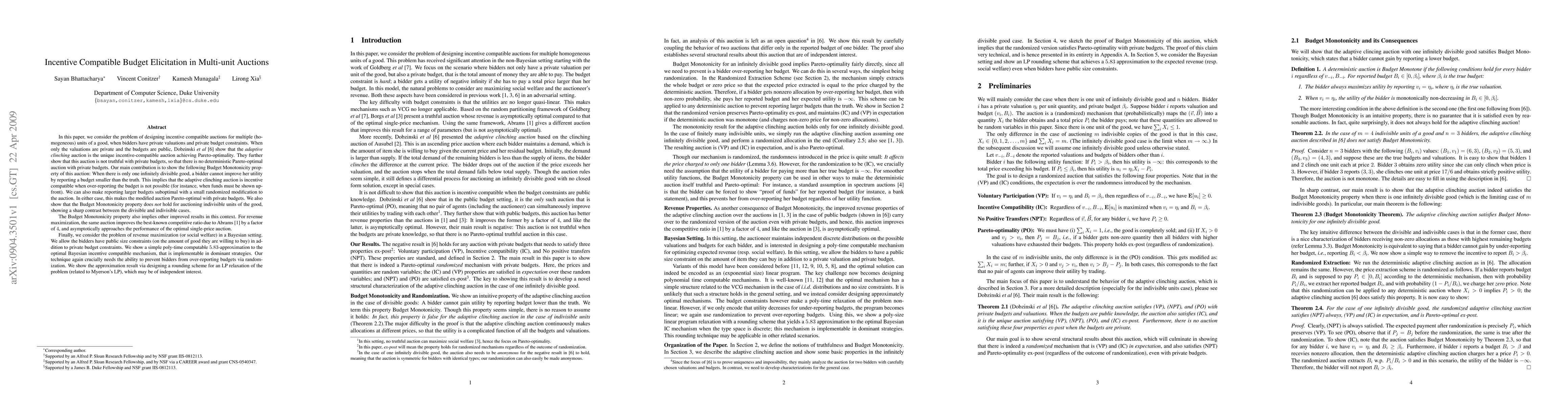 This paper designs incentive-compatible auctions for multi-unit goods with private valuations and budget constraints, introducing a randomized adaptive clinching auction that maintains Pareto-optimality. The key Budget Monotonicity property ensures bidders cannot benefit from underreporting budgets, improving revenue maximization and social welfare outcomes.