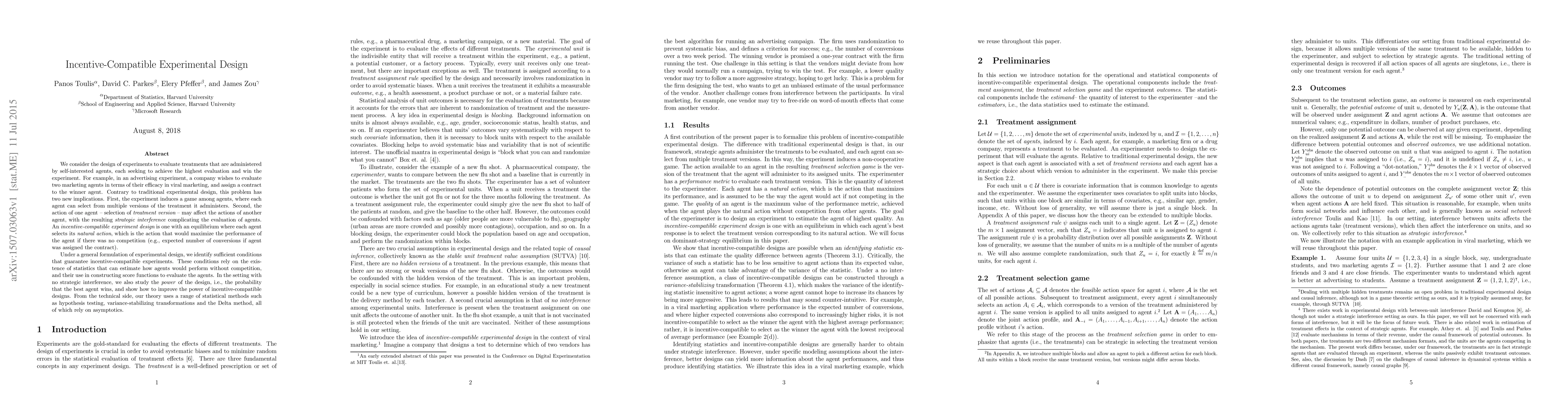 We consider the design of experiments to evaluate treatments that are administered by self-interested agents, each seeking to achieve the highest evaluation and win the experiment. For example, in an advertising experiment, a company wishes to evaluate two marketing agents in terms of their efficacy in viral marketing, and assign a contract to the winner agent. Contrary to traditional experimental design, this problem has two new implications. First, the experiment induces a game among agents, where each agent can select from multiple versions of the treatment it administers. Second, the action of one agent -- selection of treatment version -- may affect the actions of another agent, with the resulting strategic interference complicating the evaluation of agents. An incentive-compatible experiment design is one with an equilibrium where each agent selects its natural action, which is the action that would maximize the performance of the agent if there was no competition (e.g., expected number of conversions if agent was assigned the contract). Under a general formulation of experimental design, we identify sufficient conditions that guarantee incentive-compatible experiments. These conditions rely on the existence of statistics that can estimate how agents would perform without competition, and their use in constructing score functions to evaluate the agents. In the setting with no strategic interference, we also study the power of the design, i.e., the probability that the best agent wins, and show how to improve the power of incentive-compatible designs. From the technical side, our theory uses a range of statistical methods such as hypothesis testing, variance-stabilizing transformations and the Delta method, all of which rely on asymptotics.