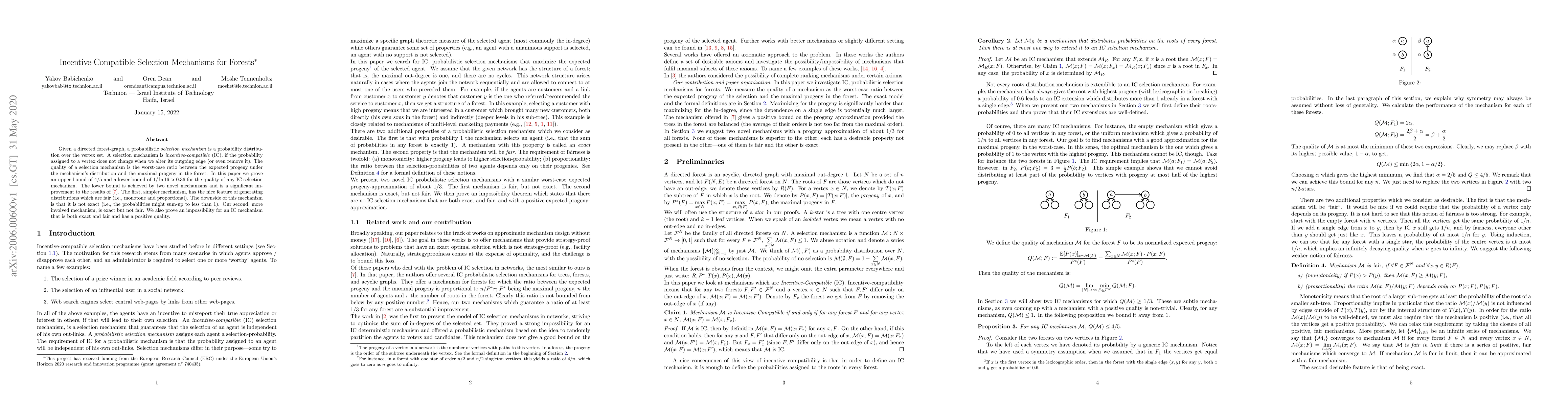 This paper investigates incentive-compatible selection mechanisms for directed forest graphs, proving an upper bound of 4/5 and a lower bound of approximately 0.36 for their quality. It introduces two novel mechanisms, one fair but not exact, and another exact but not fair, while also demonstrating the impossibility of an exact and fair mechanism with positive quality.