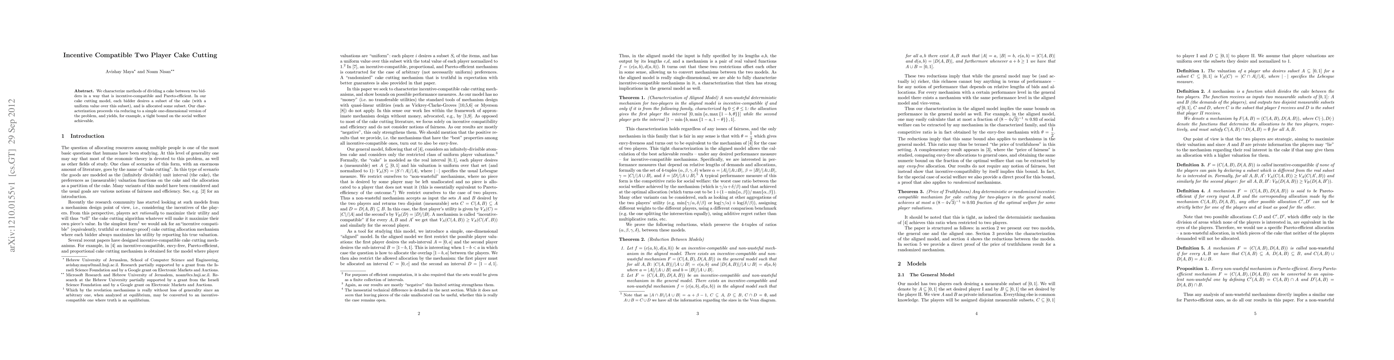 This paper characterizes incentive-compatible and Pareto-efficient methods for dividing a cake between two bidders, reducing the problem to a simpler one-dimensional model, and provides a tight bound on achievable social welfare.
