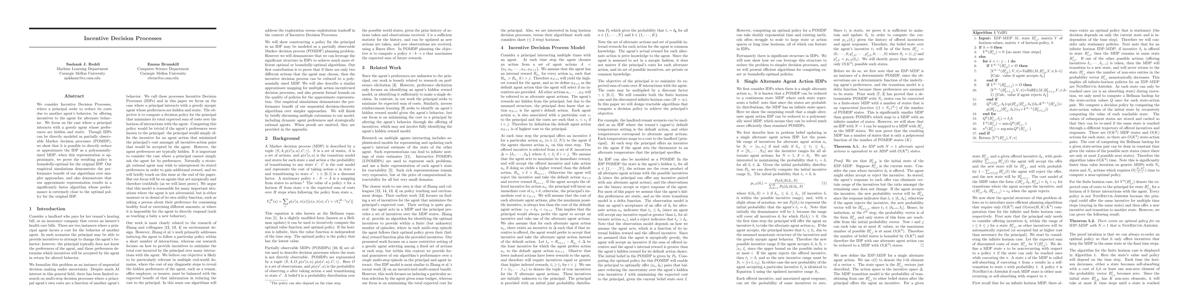 This paper explores Incentive Decision Processes (IDPs) where a principal aims to minimize costs by incentivizing a hidden-preference greedy agent. It demonstrates that IDPs can be approximated as polynomially-sized Markov Decision Processes (MDPs), resulting in boundedly-optimal policies and faster algorithms with performance close to the optimal policy.