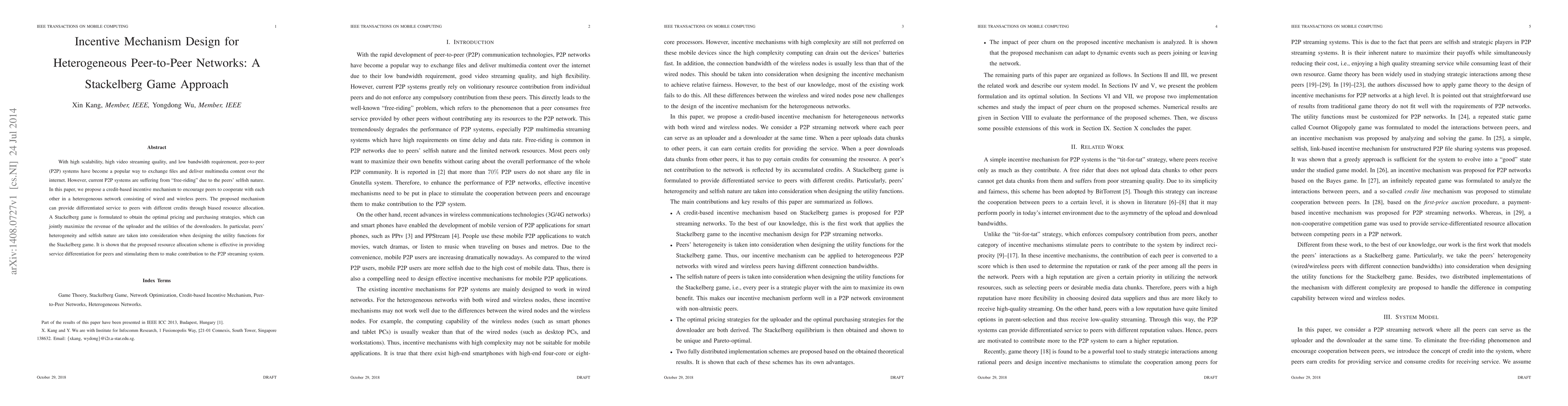 This paper proposes an incentive mechanism using a Stackelberg game to address free-riding in heterogeneous peer-to-peer networks. The credit-based approach aims to encourage cooperation among peers through differentiated service and resource allocation, optimizing pricing and purchasing strategies to maximize both uploader revenue and downloader utility.