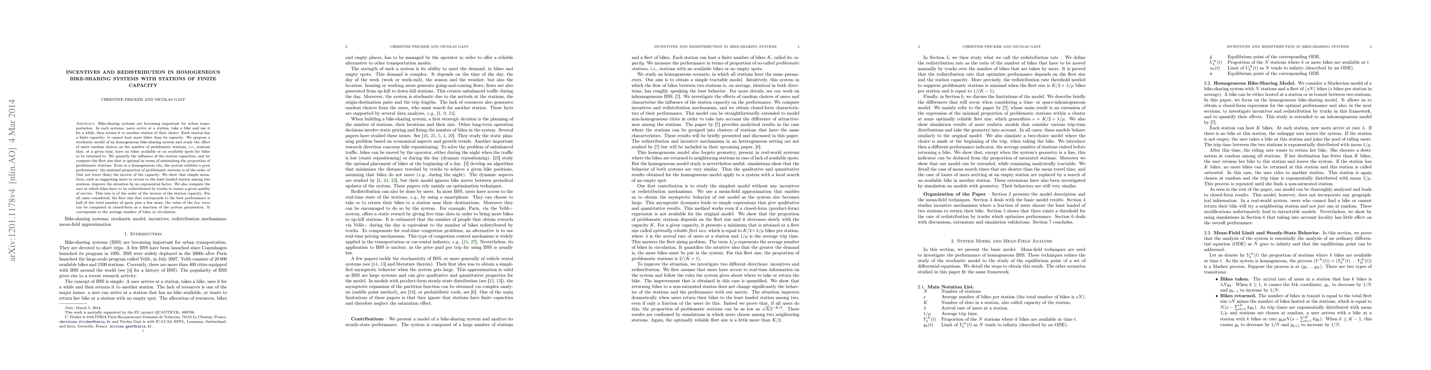 Bike-sharing systems are becoming important for urban transportation. In such systems, users arrive at a station, take a bike and use it for a while, then return it to another station of their choice. Each station has a finite capacity: it cannot host more bikes than its capacity. We propose a stochastic model of an homogeneous bike-sharing system and study the effect of users random choices on the number of problematic stations, i.e., stations that, at a given time, have no bikes available or no available spots for bikes to be returned to. We quantify the influence of the station capacities, and we compute the fleet size that is optimal in terms of minimizing the proportion of problematic stations. Even in a homogeneous city, the system exhibits a poor performance: the minimal proportion of problematic stations is of the order of (but not lower than) the inverse of the capacity. We show that simple incentives, such as suggesting users to return to the least loaded station among two stations, improve the situation by an exponential factor. We also compute the rate at which bikes have to be redistributed by trucks to insure a given quality of service. This rate is of the order of the inverse of the station capacity. For all cases considered, the fleet size that corresponds to the best performance is half of the total number of spots plus a few more, the value of the few more can be computed in closed-form as a function of the system parameters. It corresponds to the average number of bikes in circulation.