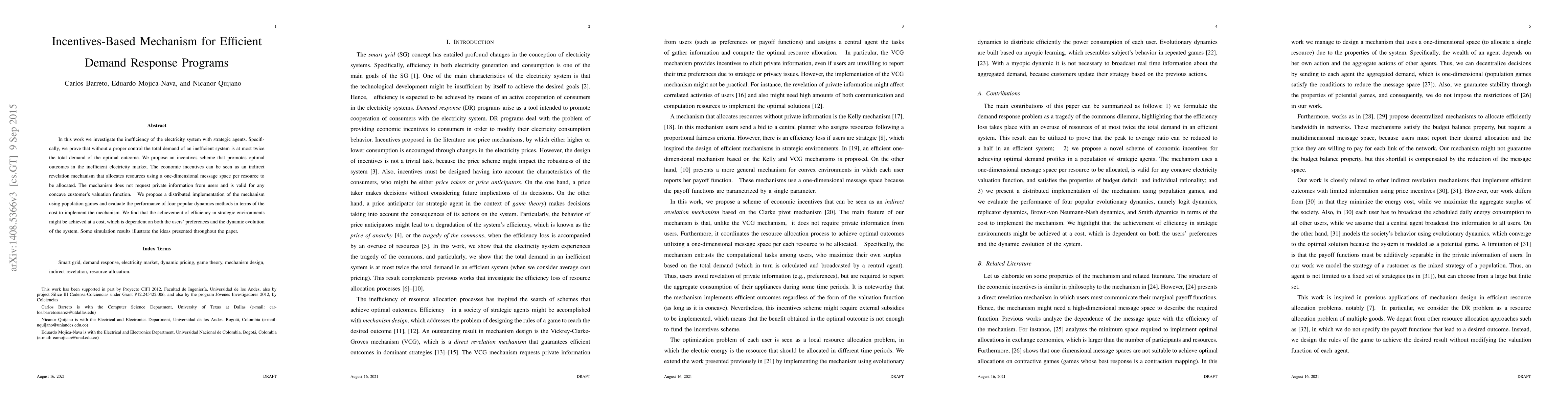 In this work we investigate the inefficiency of the electricity system with strategic agents. Specifically, we prove that without a proper control the total demand of an inefficient system is at most twice the total demand of the optimal outcome. We propose an incentives scheme that promotes optimal outcomes in the inefficient electricity market. The economic incentives can be seen as an indirect revelation mechanism that allocates resources using a one-dimensional message space per resource to be allocated. The mechanism does not request private information from users and is valid for any concave customer's valuation function. We propose a distributed implementation of the mechanism using population games and evaluate the performance of four popular dynamics methods in terms of the cost to implement the mechanism. We find that the achievement of efficiency in strategic environments might be achieved at a cost, which is dependent on both the users' preferences and the dynamic evolution of the system. Some simulation results illustrate the ideas presented throughout the paper.