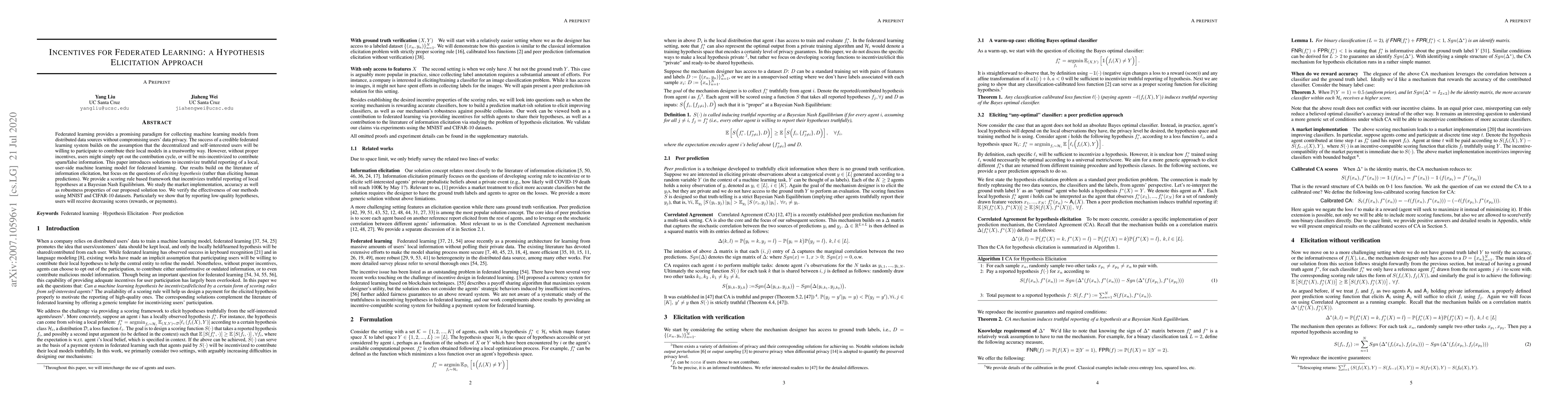 Federated learning provides a promising paradigm for collecting machine learning models from distributed data sources without compromising users' data privacy. The success of a credible federated learning system builds on the assumption that the decentralized and self-interested users will be willing to participate to contribute their local models in a trustworthy way. However, without proper incentives, users might simply opt out the contribution cycle, or will be mis-incentivized to contribute spam/false information. This paper introduces solutions to incentivize truthful reporting of a local, user-side machine learning model for federated learning. Our results build on the literature of information elicitation, but focus on the questions of eliciting hypothesis (rather than eliciting human predictions). We provide a scoring rule based framework that incentivizes truthful reporting of local hypotheses at a Bayesian Nash Equilibrium. We study the market implementation, accuracy as well as robustness properties of our proposed solution too. We verify the effectiveness of our methods using MNIST and CIFAR-10 datasets. Particularly we show that by reporting low-quality hypotheses, users will receive decreasing scores (rewards, or payments).