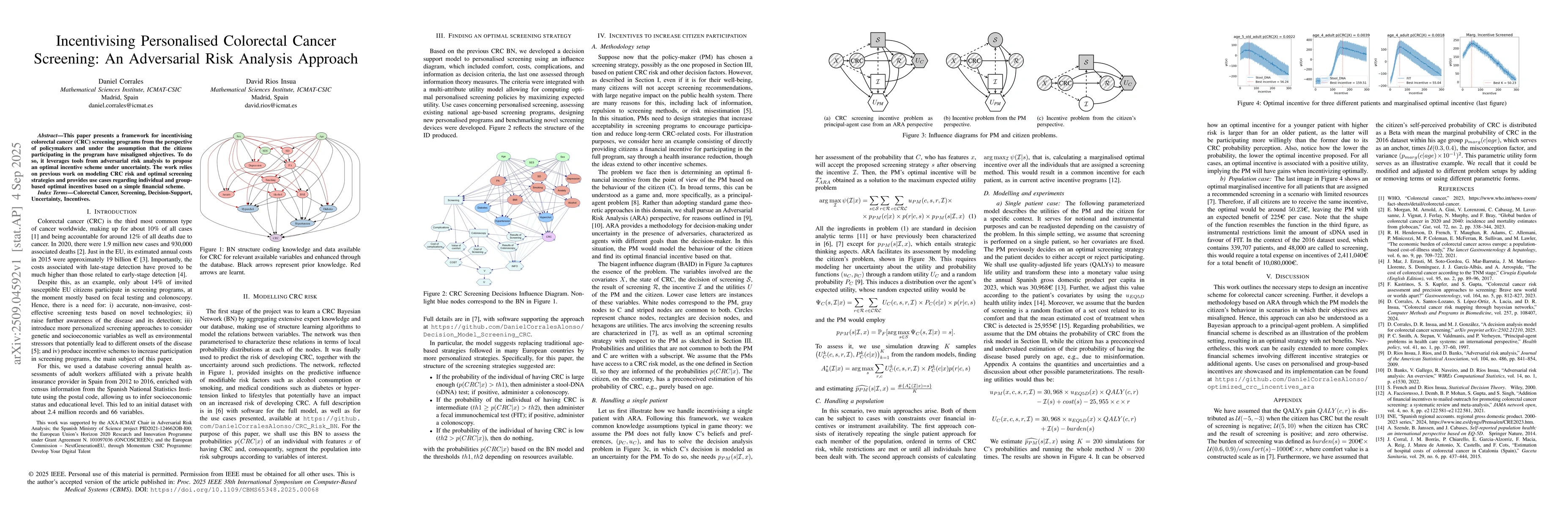 This paper presents a framework for incentivising colorectal cancer (CRC) screening programs from the perspective of policymakers and under the assumption that the citizens participating in the program have misaligned objectives. To do so, it leverages tools from adversarial risk analysis to propose an optimal incentive scheme under uncertainty. The work relies on previous work on modeling CRC risk and optimal screening strategies and provides use cases regarding individual and group-based optimal incentives based on a simple financial scheme.
