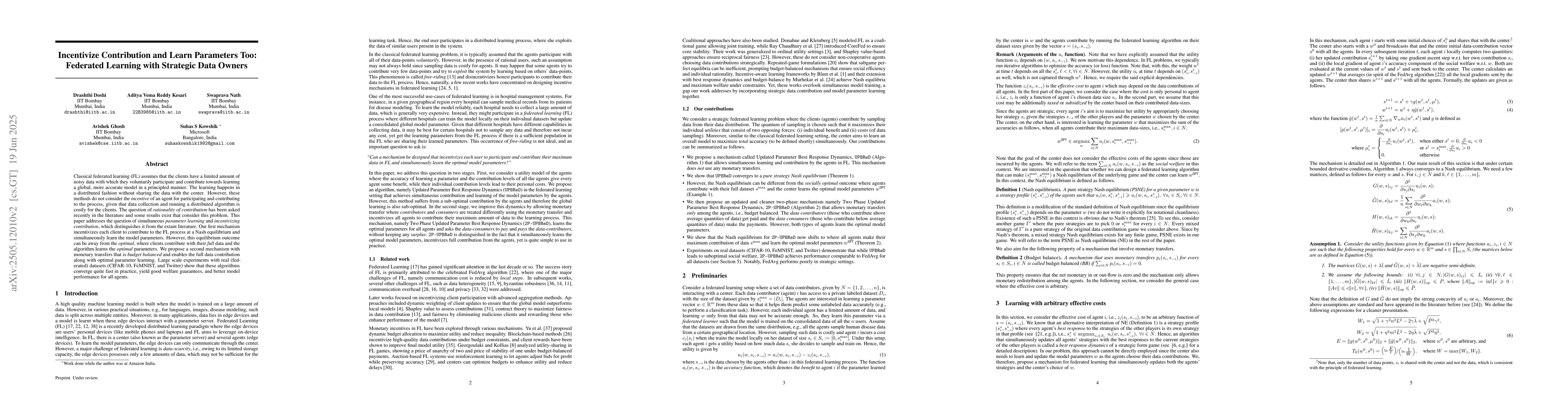 The paper proposes two mechanisms for federated learning that incentivize data owners to contribute their data while simultaneously learning global model parameters. These mechanisms involve game theory and monetary transfers to achieve Nash equilibrium and full data contribution for optimal parameter learning.