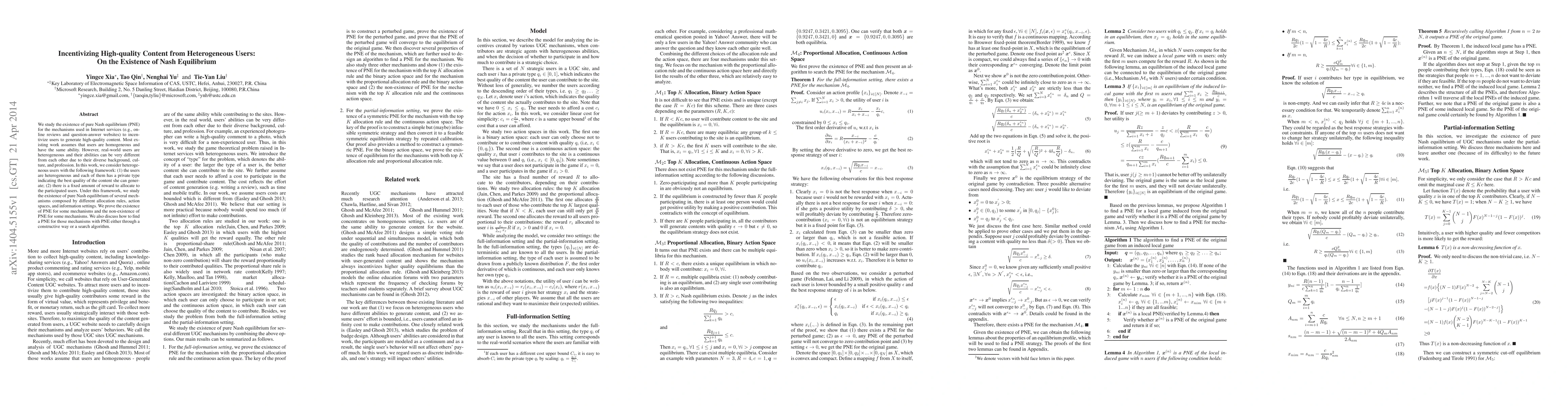We study the existence of pure Nash equilibrium (PNE) for the mechanisms used in Internet services (e.g., online reviews and question-answer websites) to incentivize users to generate high-quality content. Most existing work assumes that users are homogeneous and have the same ability. However, real-world users are heterogeneous and their abilities can be very different from each other due to their diverse background, culture, and profession. In this work, we consider heterogeneous users with the following framework: (1) the users are heterogeneous and each of them has a private type indicating the best quality of the content she can generate; (2) there is a fixed amount of reward to allocate to the participated users. Under this framework, we study the existence of pure Nash equilibrium of several mechanisms composed by different allocation rules, action spaces, and information settings. We prove the existence of PNE for some mechanisms and the non-existence of PNE for some mechanisms. We also discuss how to find a PNE for those mechanisms with PNE either through a constructive way or a search algorithm.