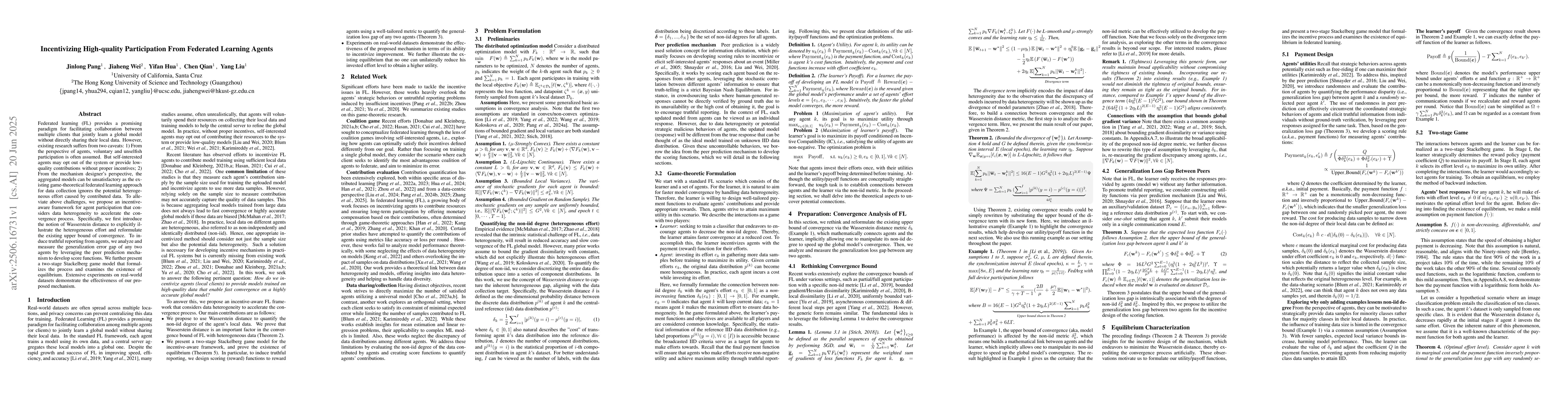 Federated learning (FL) provides a promising paradigm for facilitating collaboration between multiple clients that jointly learn a global model without directly sharing their local data. However, existing research suffers from two caveats: 1) From the perspective of agents, voluntary and unselfish participation is often assumed. But self-interested agents may opt out of the system or provide low-quality contributions without proper incentives; 2) From the mechanism designer's perspective, the aggregated models can be unsatisfactory as the existing game-theoretical federated learning approach for data collection ignores the potential heterogeneous effort caused by contributed data. To alleviate above challenges, we propose an incentive-aware framework for agent participation that considers data heterogeneity to accelerate the convergence process. Specifically, we first introduce the notion of Wasserstein distance to explicitly illustrate the heterogeneous effort and reformulate the existing upper bound of convergence. To induce truthful reporting from agents, we analyze and measure the generalization error gap of any two agents by leveraging the peer prediction mechanism to develop score functions. We further present a two-stage Stackelberg game model that formalizes the process and examines the existence of equilibrium. Extensive experiments on real-world datasets demonstrate the effectiveness of our proposed mechanism.