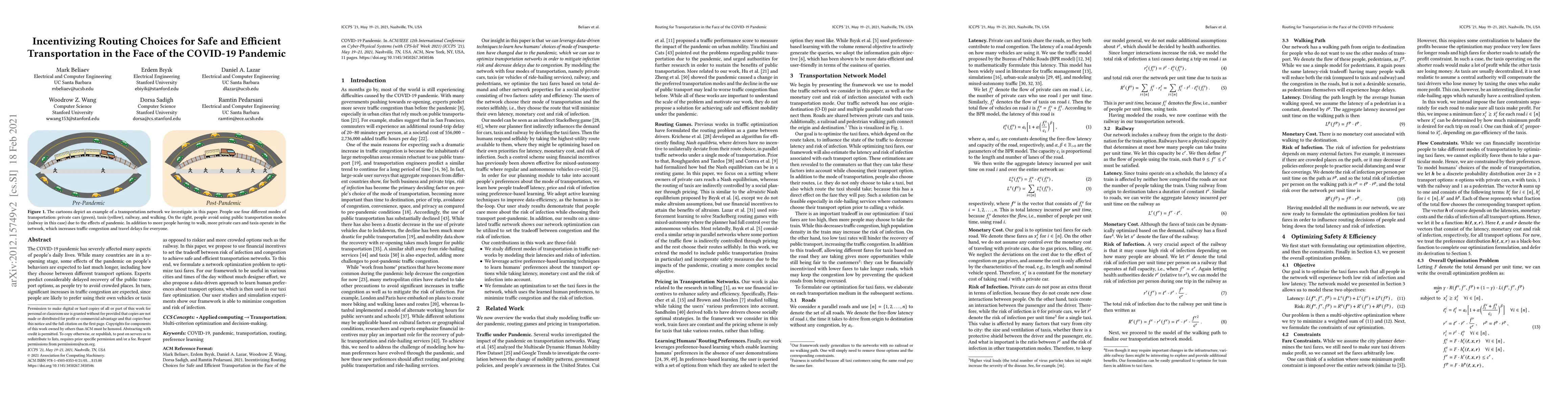 The COVID-19 pandemic has severely affected many aspects of people's daily lives. While many countries are in a re-opening stage, some effects of the pandemic on people's behaviors are expected to last much longer, including how they choose between different transport options. Experts predict considerably delayed recovery of the public transport options, as people try to avoid crowded places. In turn, significant increases in traffic congestion are expected, since people are likely to prefer using their own vehicles or taxis as opposed to riskier and more crowded options such as the railway. In this paper, we propose to use financial incentives to set the tradeoff between risk of infection and congestion to achieve safe and efficient transportation networks. To this end, we formulate a network optimization problem to optimize taxi fares. For our framework to be useful in various cities and times of the day without much designer effort, we also propose a data-driven approach to learn human preferences about transport options, which is then used in our taxi fare optimization. Our user studies and simulation experiments show our framework is able to minimize congestion and risk of infection.