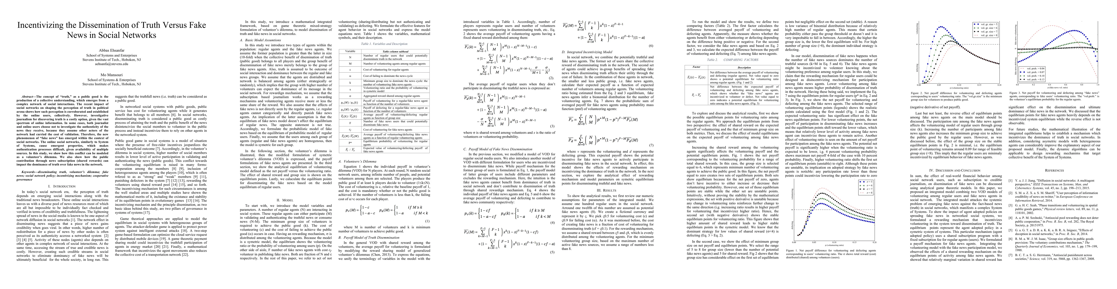 The concept of truth, as a public good is the production of a collective understanding, which emerges from a complex network of social interactions. The recent impact of social networks on shaping the perception of truth in political arena shows how such perception is corroborated and established by the online users, collectively. However, investigative journalism for discovering truth is a costly option, given the vast spectrum of online information. In some cases, both journalist and online users choose not to investigate the authenticity of the news they receive, because they assume other actors of the network had carried the cost of validation. Therefore, the new phenomenon of "fake news" has emerged within the context of social networks. The online social networks, similarly to System of Systems, cause emergent properties, which makes authentication processes difficult, given availability of multiple sources. In this study, we show how this conflict can be modeled as a volunteer's dilemma. We also show how the public contribution through news subscription (shared rewards) can impact the dominance of truth over fake news in the network.