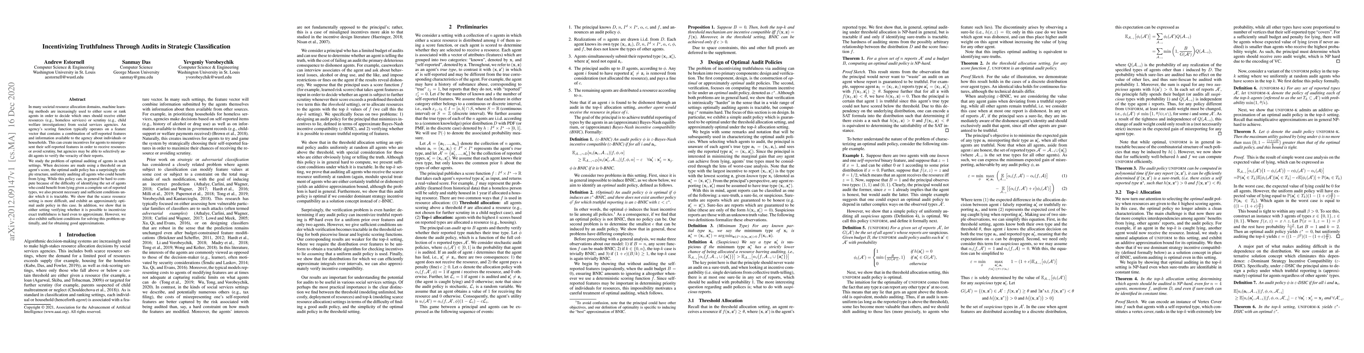 In many societal resource allocation domains, machine learning methods are increasingly used to either score or rank agents in order to decide which ones should receive either resources (e.g., homeless services) or scrutiny (e.g., child welfare investigations) from social services agencies. An agency's scoring function typically operates on a feature vector that contains a combination of self-reported features and information available to the agency about individuals or households.This can create incentives for agents to misrepresent their self-reported features in order to receive resources or avoid scrutiny, but agencies may be able to selectively audit agents to verify the veracity of their reports. We study the problem of optimal auditing of agents in such settings. When decisions are made using a threshold on an agent's score, the optimal audit policy has a surprisingly simple structure, uniformly auditing all agents who could benefit from lying. While this policy can, in general, be hard to compute because of the difficulty of identifying the set of agents who could benefit from lying given a complete set of reported types, we also present necessary and sufficient conditions under which it is tractable. We show that the scarce resource setting is more difficult, and exhibit an approximately optimal audit policy in this case. In addition, we show that in either setting verifying whether it is possible to incentivize exact truthfulness is hard even to approximate. However, we also exhibit sufficient conditions for solving this problem optimally, and for obtaining good approximations.