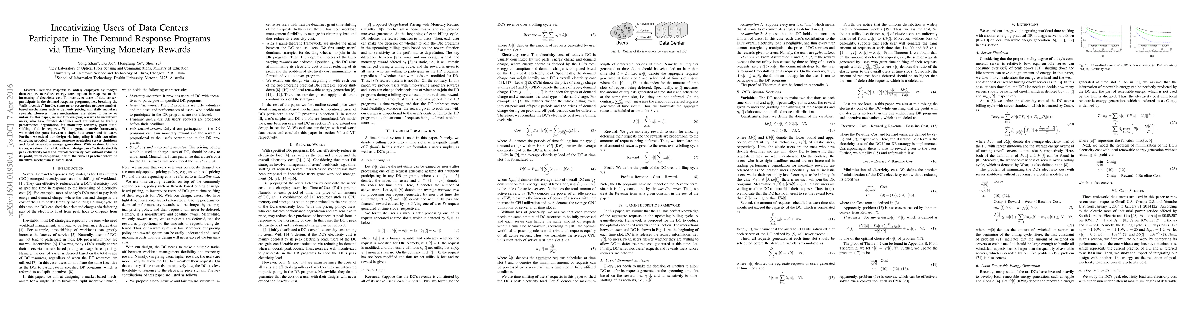 This paper proposes a time-varying monetary reward system to incentivize data center users to participate in demand response programs, effectively addressing the "split incentive" issue. The game-theoretic model integrates server shutdown and local renewable energy strategies, demonstrating reduced peak load and electricity costs without compromising profit.