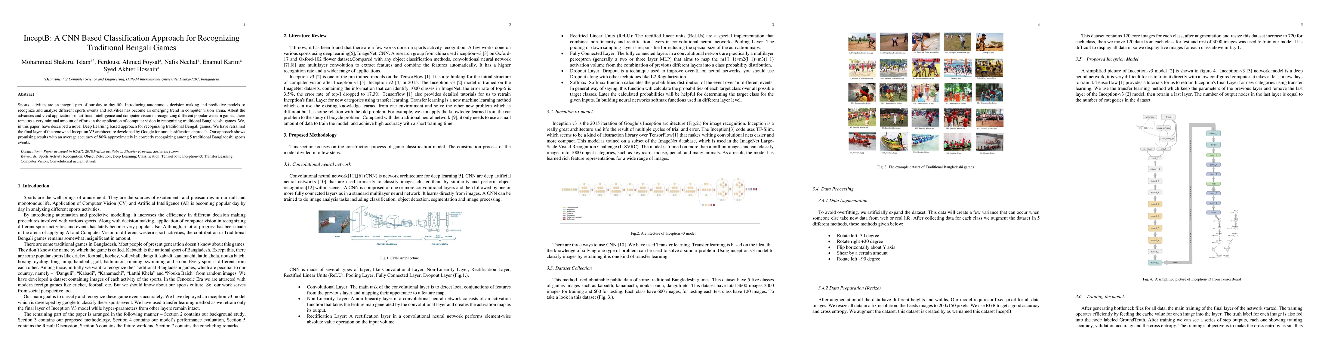 A CNN-based classification approach using Google's Inception V3 model with transfer learning was used to recognize traditional Bangladeshi games.