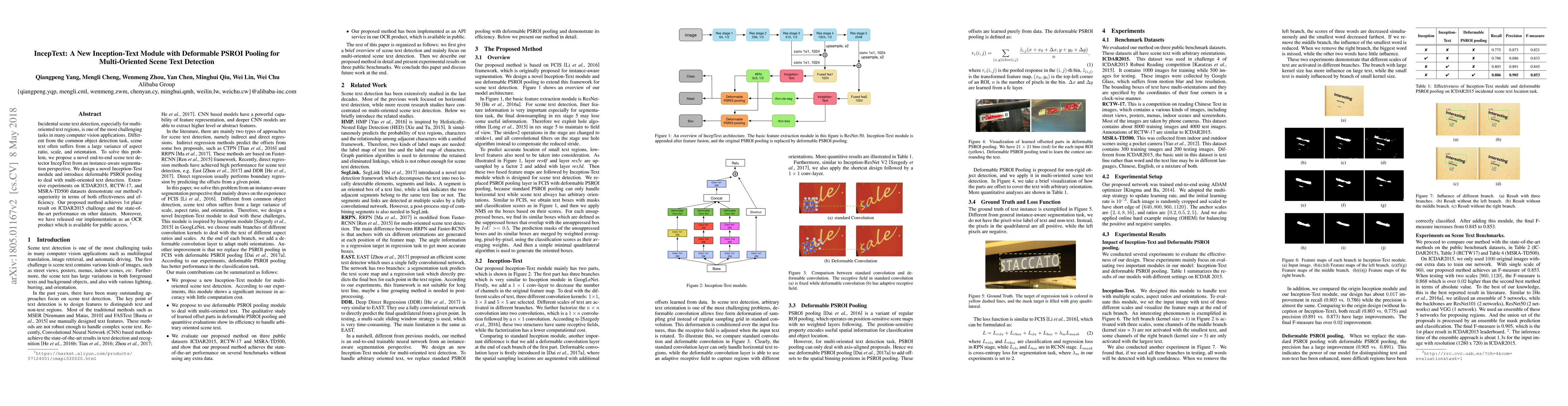 The IncepText method introduces a novel Inception-Text module and deformable PSROI pooling for detecting multi-oriented scene text, achieving top results on ICDAR2015 and state-of-the-art performance on other datasets. The implementation is publicly available as an OCR product.
