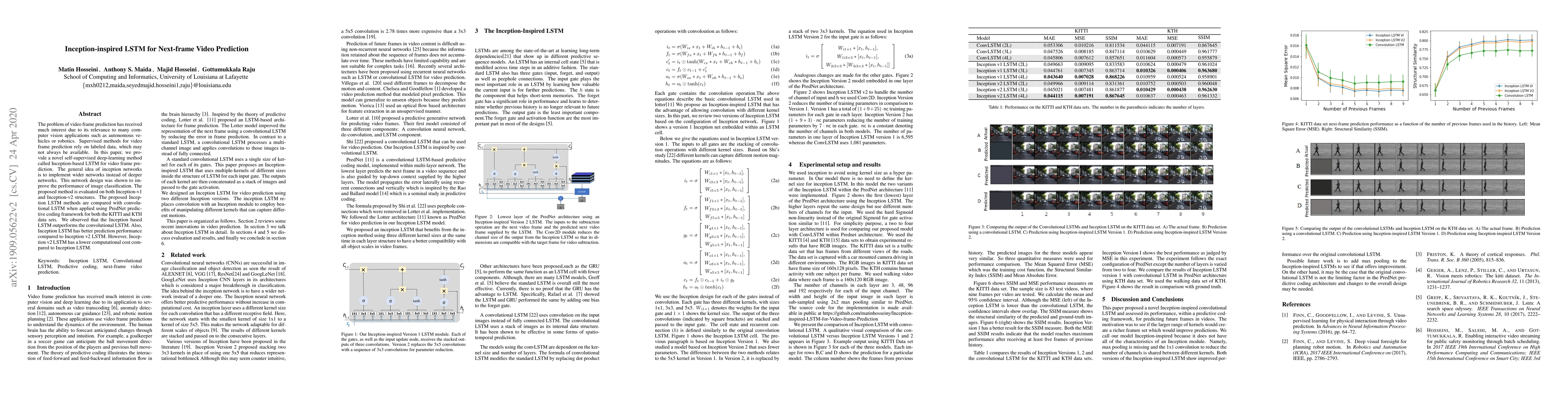 This paper introduces an unsupervised deep-learning method called Inception-based LSTM for video frame prediction, showing improved performance over convolutional LSTM in the PredNet framework. While Inception LSTM outperforms in prediction accuracy, Inception v2 LSTM is more computationally efficient.
