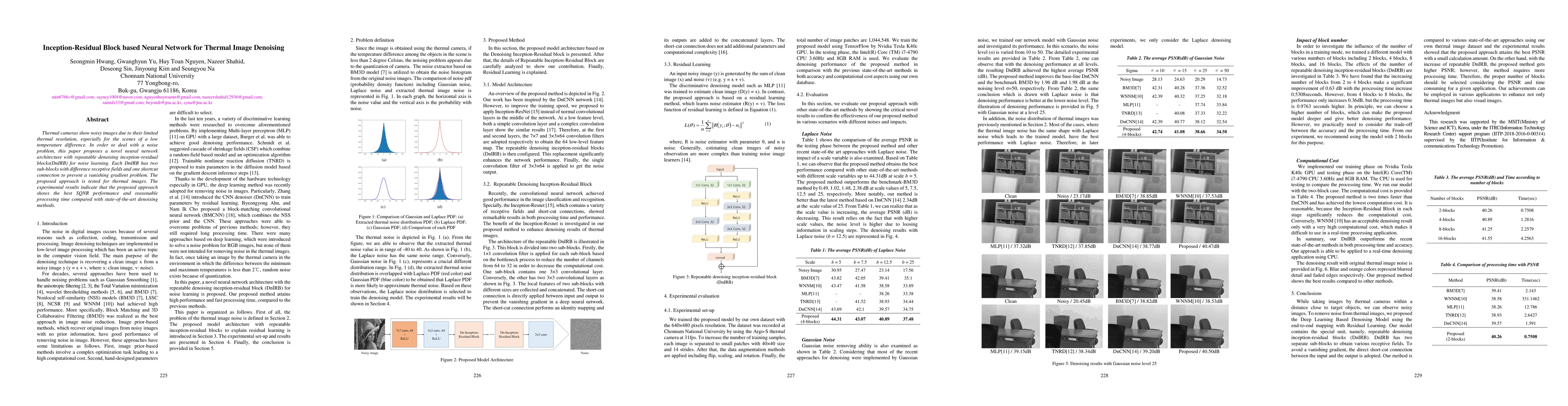 A new neural network architecture called DnIRB is proposed to denoise thermal images, achieving the best SQNR performance and reasonable processing time compared to state-of-the-art methods.