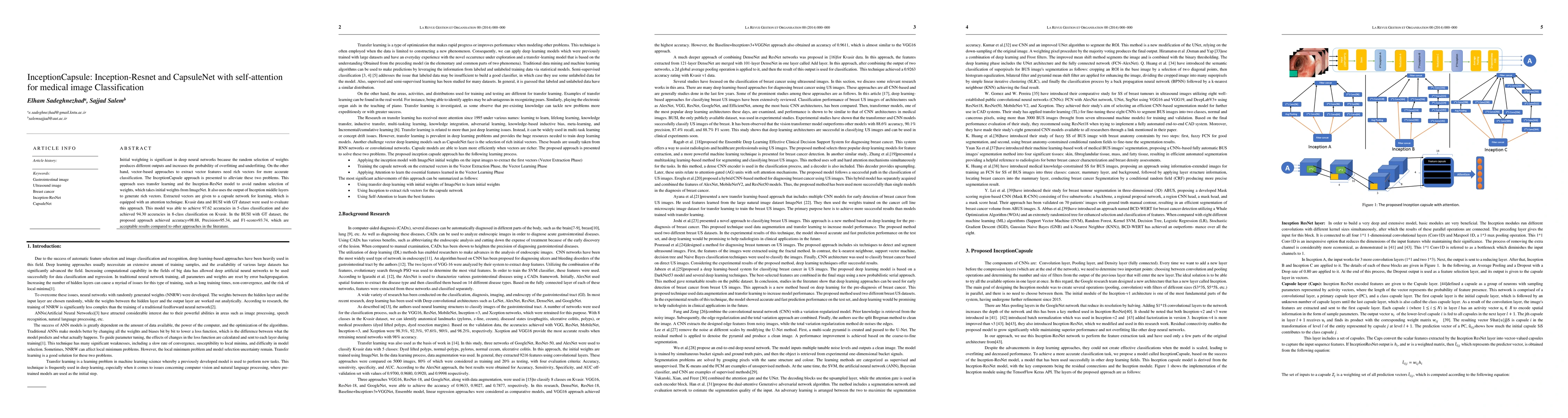 InceptionCapsule combines Inception-ResNet and CapsuleNet with self-attention for medical image classification, utilizing transfer learning to mitigate overfitting and underfitting. The model achieved high accuracy rates on Kvasir and BUSI datasets, demonstrating its effectiveness in medical image classification.