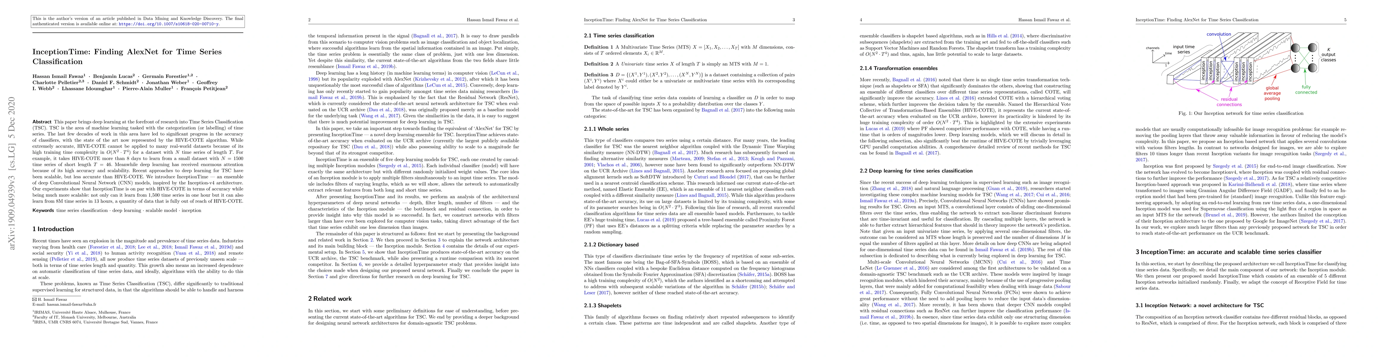 InceptionTime introduces an ensemble of deep CNN models inspired by the Inception-v4 architecture to achieve high accuracy in time series classification, rivaling the state-of-the-art HIVE-COTE algorithm while significantly improving scalability, learning from large datasets in a fraction of the time.