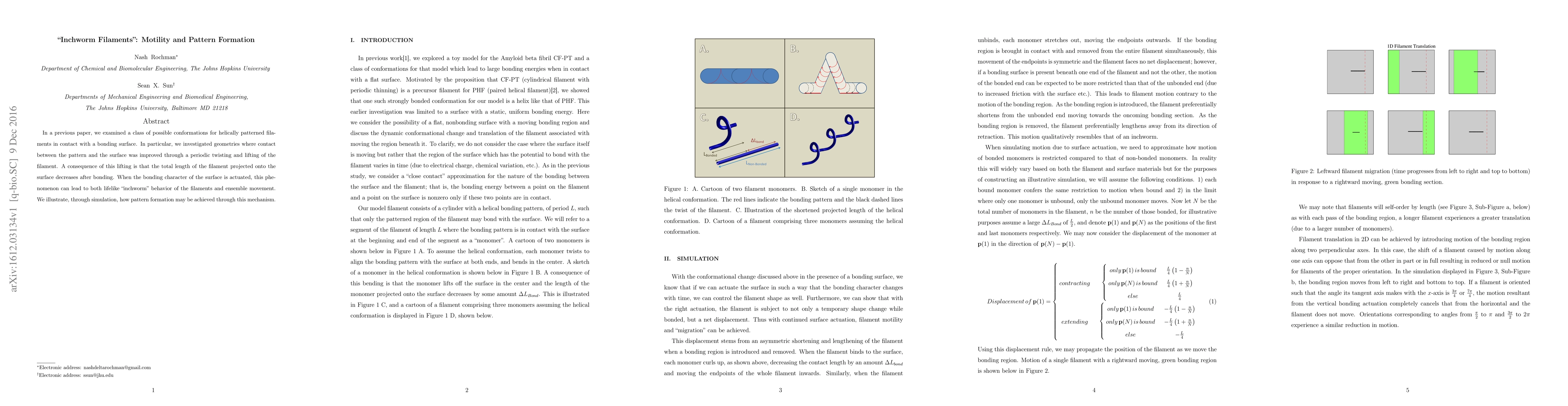 In a previous paper, we examined a class of possible conformations for helically patterned filaments in contact with a bonding surface. In particular, we investigated geometries where contact between the pattern and the surface was improved through a periodic twisting and lifting of the filament. A consequence of this lifting is that the total length of the filament projected onto the surface decreases after bonding. When the bonding character of the surface is actuated, this phenomenon can lead to both lifelike "inchworm" behavior of the filaments and ensemble movement. We illustrate, through simulation, how pattern formation may be achieved through this mechanism.