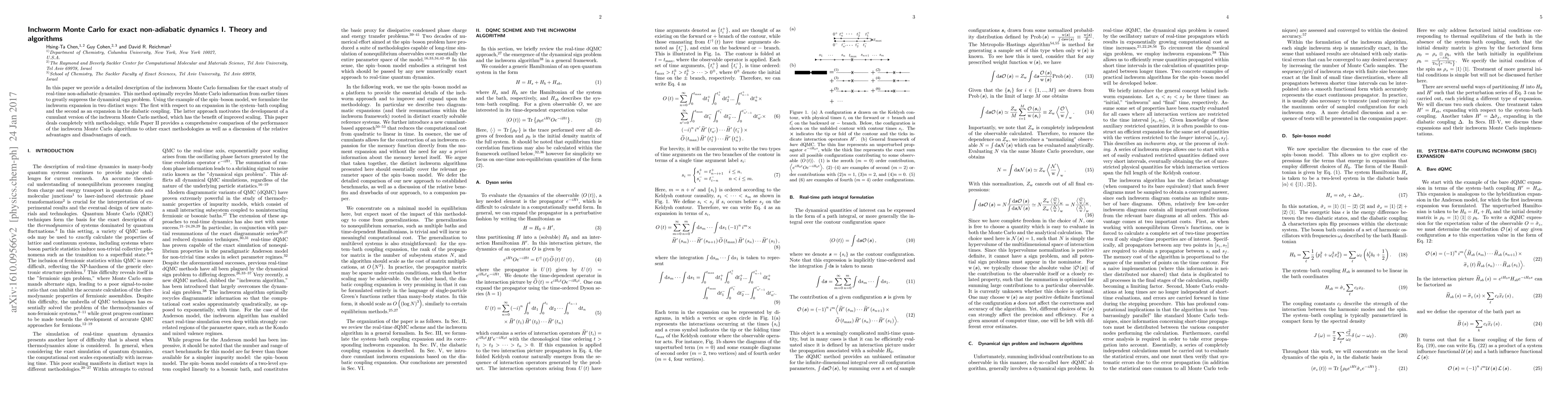 In this paper we provide a detailed description of the inchworm Monte Carlo formalism for the exact study of real-time non-adiabatic dynamics. This method optimally recycles Monte Carlo information from earlier times to greatly suppress the dynamical sign problem. Using the example of the spin-boson model, we formulate the inchworm expansion in two distinct ways: The first with respect to an expansion in the system-bath coupling and the second as an expansion in the diabatic coupling. The latter approach motivates the development of a cumulant version of the inchworm Monte Carlo method, which has the benefit of improved scaling. This paper deals completely with methodology, while Paper II provides a comprehensive comparison of the performance of the inchworm Monte Carlo algorithms to other exact methodologies as well as a discussion of the relative advantages and disadvantages of each.