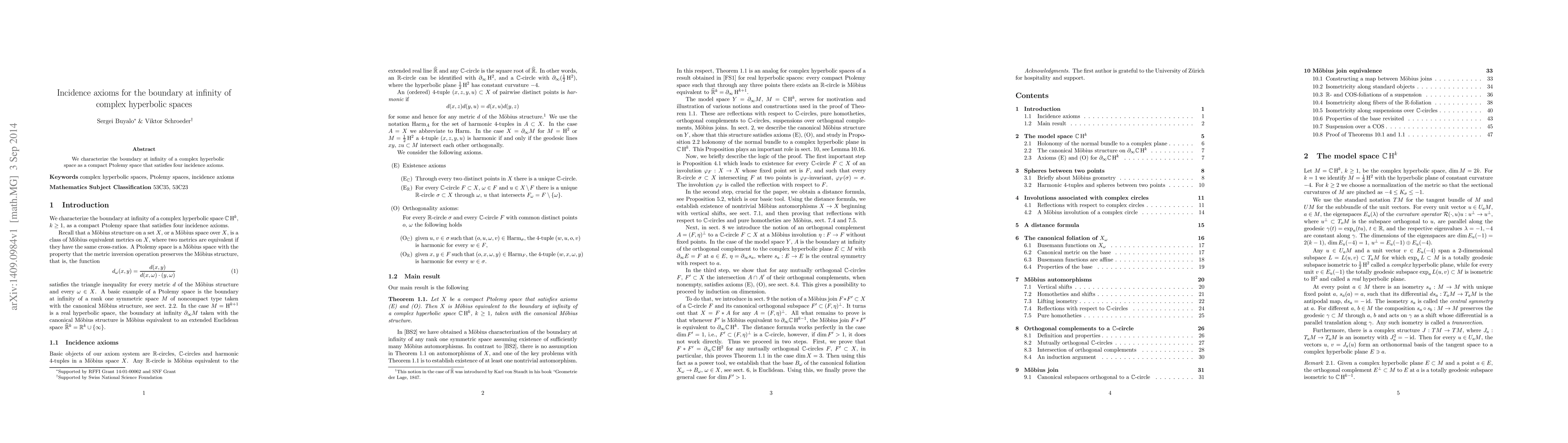 Summary: This paper characterizes the boundary at infinity of complex hyperbolic spaces as a compact Ptolemy space, establishing it through four specific incidence axioms. These axioms provide a rigorous framework for understanding the geometric properties of the boundary.