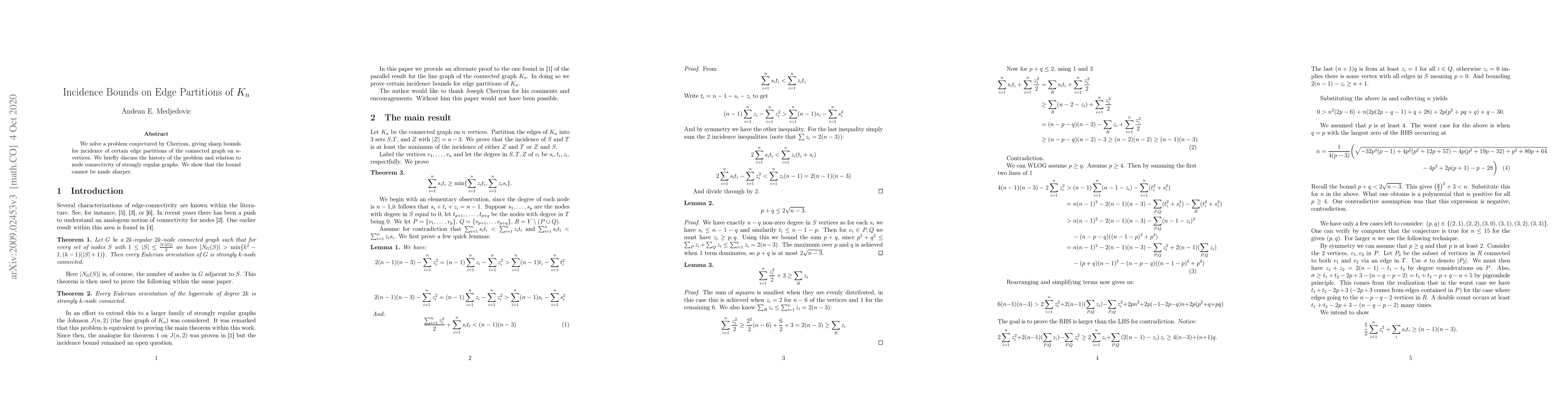 This paper establishes sharp bounds for the incidence of edge partitions in a connected graph on n vertices, solving a conjecture by Cheriyan. It also shows that these bounds cannot be made sharper.