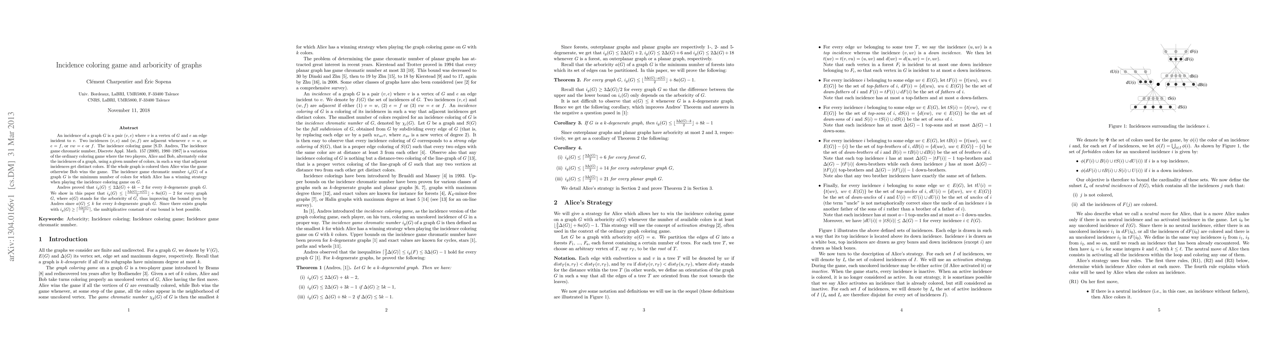 This paper investigates the incidence coloring game and establishes a new upper bound for the incidence game chromatic number $i_g(G)$ in terms of the graph's maximum degree $\Delta(G)$ and its arboricity $a(G)$. The authors show that $i_g(G) \le \lfloor\frac{3\Delta(G) - a(G)}{2}\rfloor + 8a(G) - 2$, improving previous bounds and demonstrating the best possible multiplicative constant.