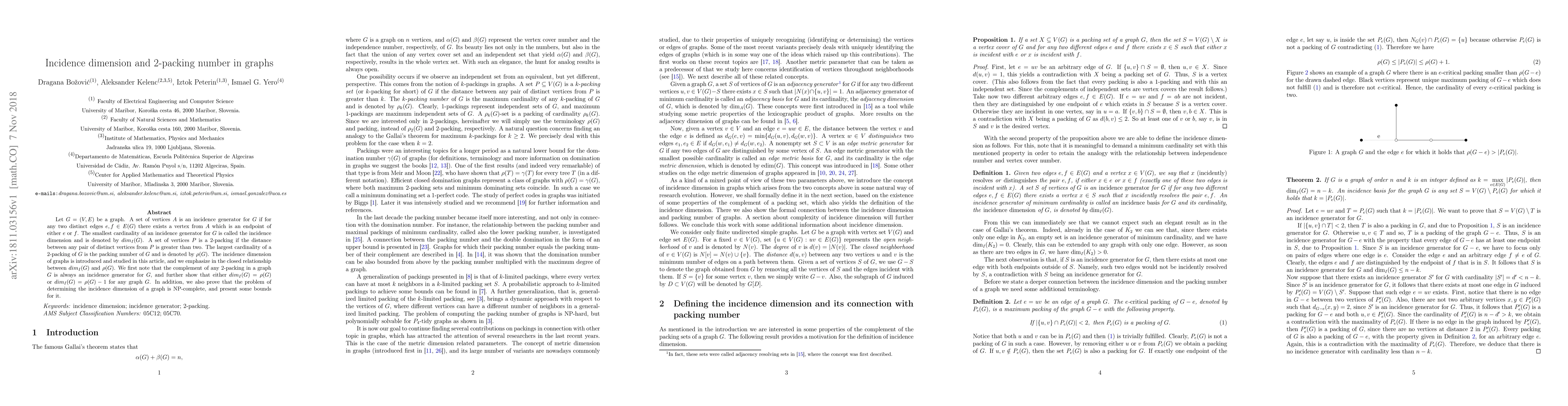 The paper studies the relationship between a graph's incidence dimension (smallest number of vertices needed to cover all edges) and 2-packing number (largest set of vertices with distance > 2). It finds that these two numbers are either equal or differ by one, with the problem of determining the incidence dimension being NP-complete.