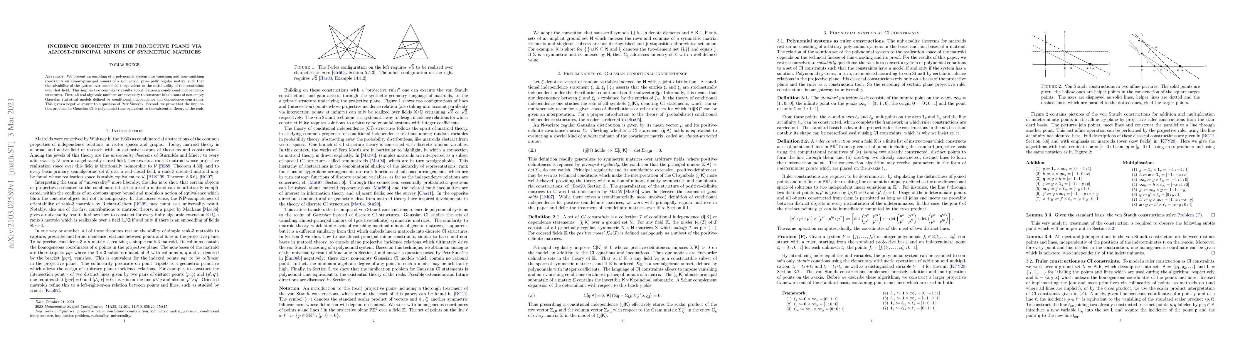 We present an encoding of a polynomial system into vanishing and non-vanishing constraints on almost-principal minors of a symmetric, principally regular matrix, such that the solvability of the system over some field is equivalent to the satisfiability of the constraints over that field. This implies two complexity results about Gaussian conditional independence structures. First, all real algebraic numbers are necessary to construct inhabitants of non-empty Gaussian statistical models defined by conditional independence and dependence constraints. This gives a negative answer to a question of Petr \v{S}ime\v{c}ek. Second, we prove that the implication problem for Gaussian CI is polynomial-time equivalent to the existential theory of the reals.