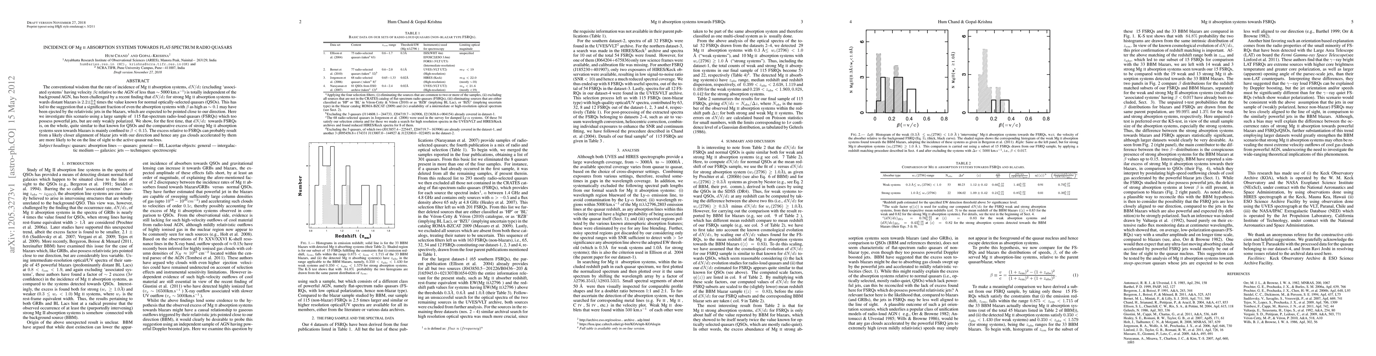 The conventional wisdom that the rate of incidence of Mg II absorption systems, dN/dz (excluding `associated systems' having velocity beta*c relative to the AGN of less than ~5000 km/s) is totally independent of the background AGN, has been challenged by a recent finding that dN/dz for strong Mg II absorption systems towards distant blazars is 2.2 \pm_{0.6}^{0.8} times the value known for normal optically-selected quasars (QSOs). This has led to the suggestion that a significant fraction of even the absorption systems with beta as high as 0.1 may have been ejected by the relativistic jets in the blazars, which are expected to be pointed close to our direction. Here we investigate this scenario using a large sample of 115 flat-spectrum radio-loud quasars (FSRQs) which too possess powerful jets, but are only weakly polarized. We show, for the first time, that dN/dz towards FSRQs is, on the whole, quite similar to that known for QSOs and the comparative excess of strong \mgii absorption systems seen towards blazars is mainly confined to beta< 0.15. The excess relative to FSRQs can probably result from a likely closer alignment of blazar jets with our direction and hence any gas clouds accelerated by them are more likely to be on the line of sight to the active quasar nucleus.