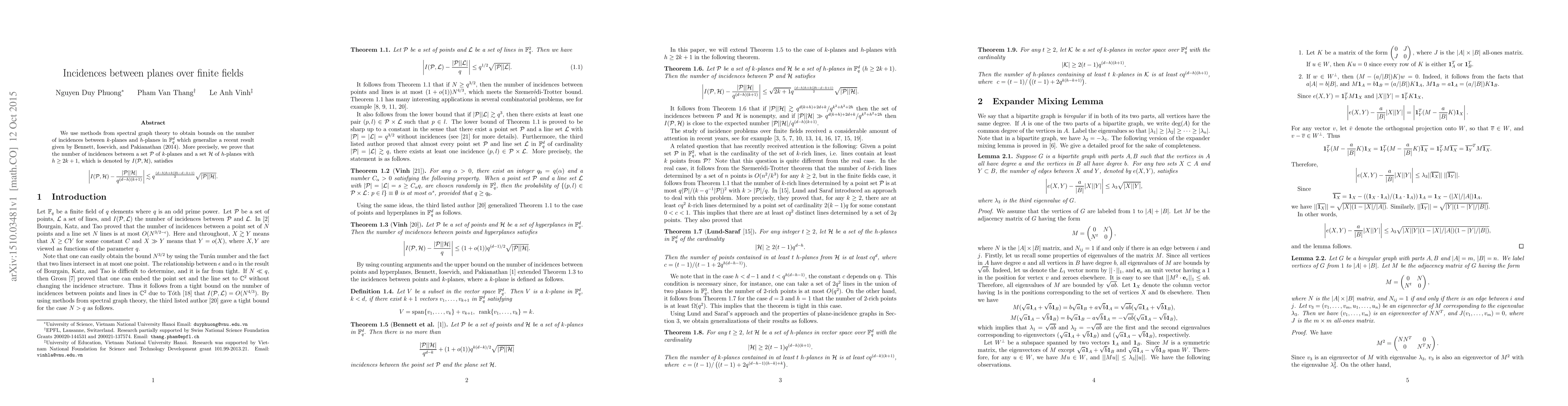 This paper uses spectral graph theory to derive bounds on the number of incidences between $k$-planes and $h$-planes in $\mathbb{F}_q^d$, generalizing a previous result. The key finding is a bound on the incidences $I(\mathcal{P},\mathcal{H})$ for $h \ge 2k+1$ in terms of $q$ and the sizes of the plane sets.