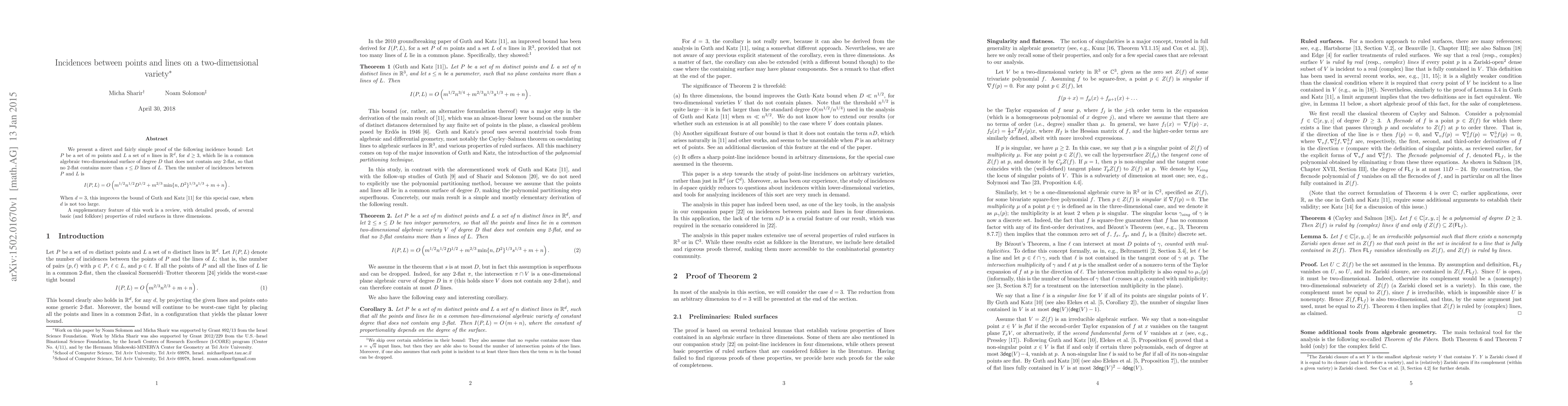 This paper provides a simplified proof for an incidence bound between points and lines on a two-dimensional variety in ${\mathbb R}^d$ for $d\ge 3$, improving existing bounds for the special case when $d=3$ and $D$ is not excessively large. It also includes detailed proofs of fundamental properties of ruled surfaces in three dimensions.