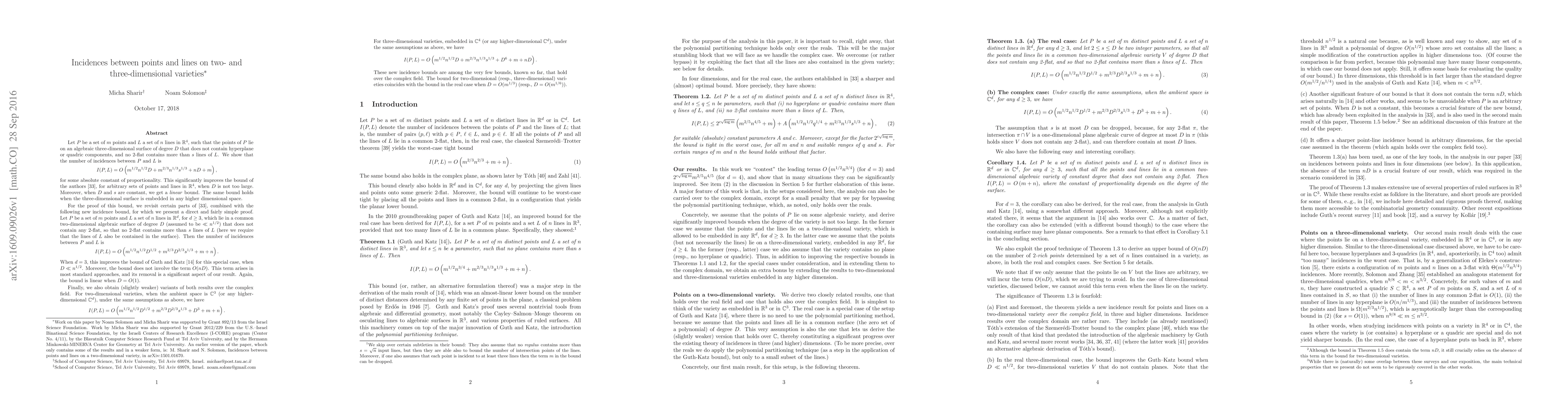 Let $P$ be a set of $m$ points and $L$ a set of $n$ lines in $\mathbb R^4$, such that the points of $P$ lie on an algebraic three-dimensional surface of degree $D$ that does not contain hyperplane or quadric components, and no 2-flat contains more than $s$ lines of $L$. We show that the number of incidences between $P$ and $L$ is $$ I(P,L) = O\left(m^{1/2}n^{1/2}D + m^{2/3}n^{1/3}s^{1/3} + nD + m\right) , $$ for some absolute constant of proportionality. This significantly improves the bound of the authors, for arbitrary sets of points and lines in $\mathbb R^4$, when $D$ is not too large. The same bound holds when the three-dimensional surface is embedded in any higher dimensional space. For the proof of this bound, we revisit certain parts of [Sharir-Solomon16], combined with the following new incidence bound. Let $P$ be a set of $m$ points and $L$ a set of $n$ lines in $\mathbb R^d$, for $d\ge 3$, which lie in a common two-dimensional algebraic surface of degree $D$ (assumed to be $\ll n^{1/2}$) that does not contain any 2-flat, so that no 2-flat contains more than $s$ lines of $L$ (here we require that the lines of $L$ also be contained in the surface). Then the number of incidences between $P$ and $L$ is $$ I(P,L) = O\left(m^{1/2}n^{1/2}D^{1/2} + m^{2/3}D^{2/3}s^{1/3} + m + n\right). $$ When $d=3$, this improves the bound of Guth and Katz for this special case, when $D \ll n^{1/2}$. Moreover, the bound does not involve the term $O(nD)$, that arises in most standard approaches, and its removal is a significant aspect of our result. Finally, we also obtain (slightly weaker) variants of both results over the complex field. For two-dimensional varieties, the bound is as in the real case, with an added term of $O(D^3)$. For three-dimensional varieties, the bound is as in the real case, with an added term of $O(D^6)$.