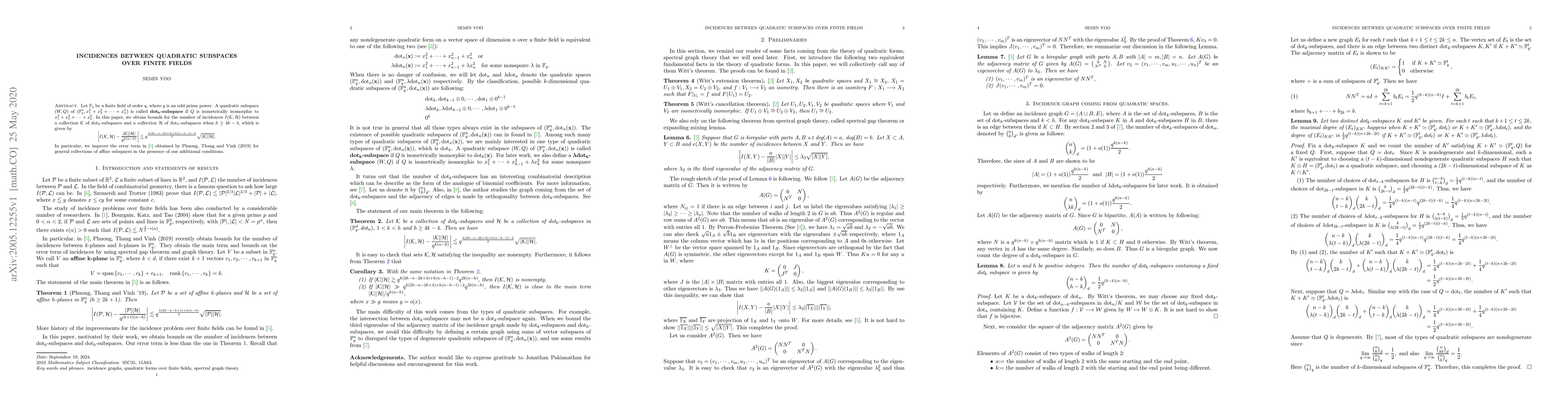 Let $\mathbb{F}_{q}$ be a finite field of order $q$, where $q$ is an odd prime power. A quadratic subspace $(W,Q)$ of $(\mathbb{F}_{q}^{n},x_{1}^{2}+x_{2}^{2}+\cdots+x_{n}^{2})$ is called dot$_{k}$-subspace if $Q$ is isometrically isomorphic to $x_{1}^{2}+x_{2}^{2}+\cdots+x_{k}^{2}$. In this paper, we obtain bounds for the number of incidences $I(\mathcal{K},\mathcal{H})$ between a collection $\mathcal{K}$ of dot$_{k}$-subspaces and a collection $\mathcal{H}$ of dot$_{h}$-subspaces when $h \geq 4k-4$, which is given by \[\left | I(\mathcal{K},\mathcal{H})-\frac{|\mathcal{K}||\mathcal{H}|}{q^{k(n-h)}}\right | \lesssim q^{\frac{k(2h-n-2k+4)+h(n-h-1)-2}{2}}\sqrt{|\mathcal{K}||\mathcal{H}|}. \] In particular, we improve the error term obtained by Phuong, Thang and Vinh (2019) for general collections of affine subspaces in the presence of our additional conditions.