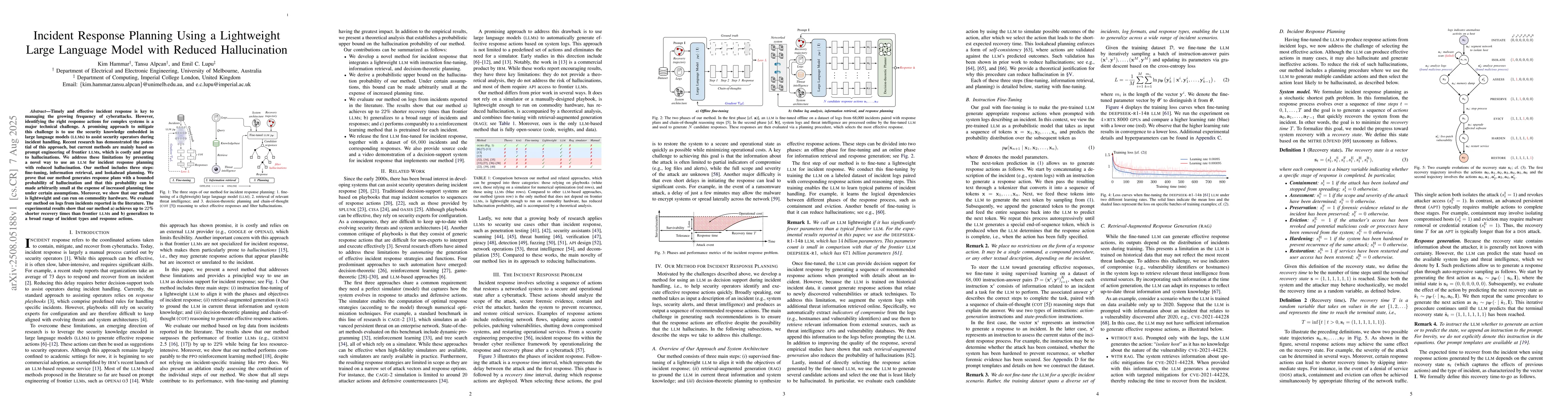 Timely and effective incident response is key to managing the growing frequency of cyberattacks. However, identifying the right response actions for complex systems is a major technical challenge. A promising approach to mitigate this challenge is to use the security knowledge embedded in large language models (LLMs) to assist security operators during incident handling. Recent research has demonstrated the potential of this approach, but current methods are mainly based on prompt engineering of frontier LLMs, which is costly and prone to hallucinations. We address these limitations by presenting a novel way to use an LLM for incident response planning with reduced hallucination. Our method includes three steps: fine-tuning, information retrieval, and lookahead planning. We prove that our method generates response plans with a bounded probability of hallucination and that this probability can be made arbitrarily small at the expense of increased planning time under certain assumptions. Moreover, we show that our method is lightweight and can run on commodity hardware. We evaluate our method on logs from incidents reported in the literature. The experimental results show that our method a) achieves up to 22% shorter recovery times than frontier LLMs and b) generalizes to a broad range of incident types and response actions.