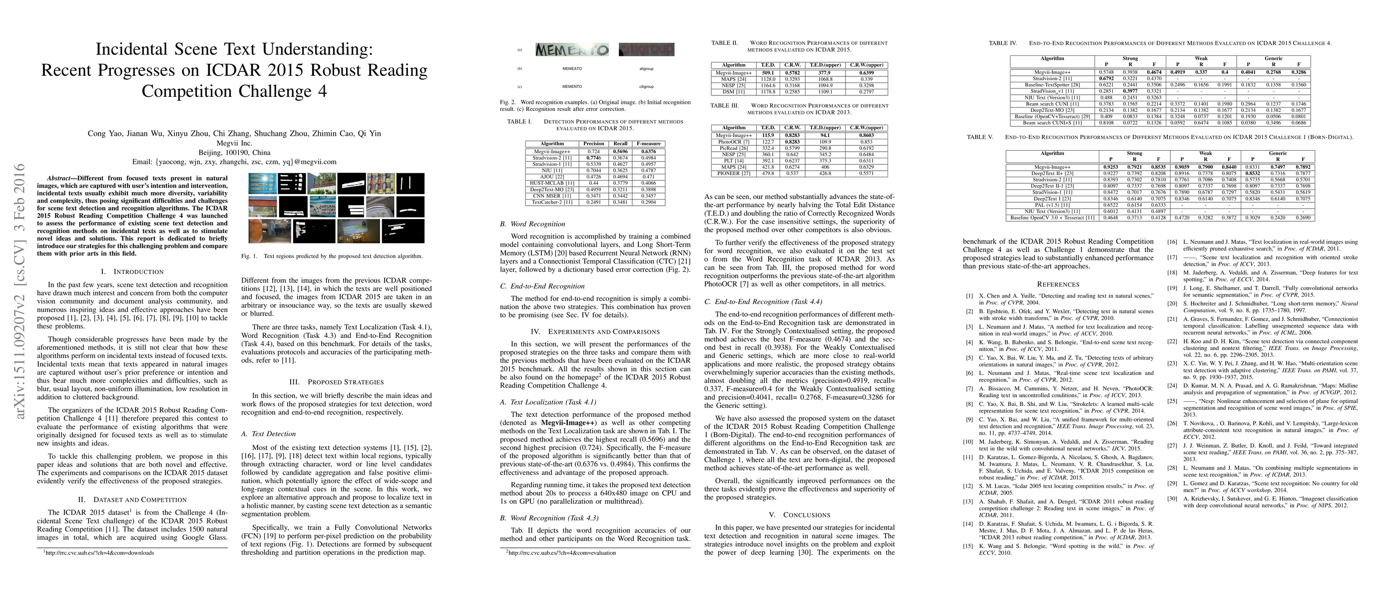 Different from focused texts present in natural images, which are captured with user's intention and intervention, incidental texts usually exhibit much more diversity, variability and complexity, thus posing significant difficulties and challenges for scene text detection and recognition algorithms. The ICDAR 2015 Robust Reading Competition Challenge 4 was launched to assess the performance of existing scene text detection and recognition methods on incidental texts as well as to stimulate novel ideas and solutions. This report is dedicated to briefly introduce our strategies for this challenging problem and compare them with prior arts in this field.