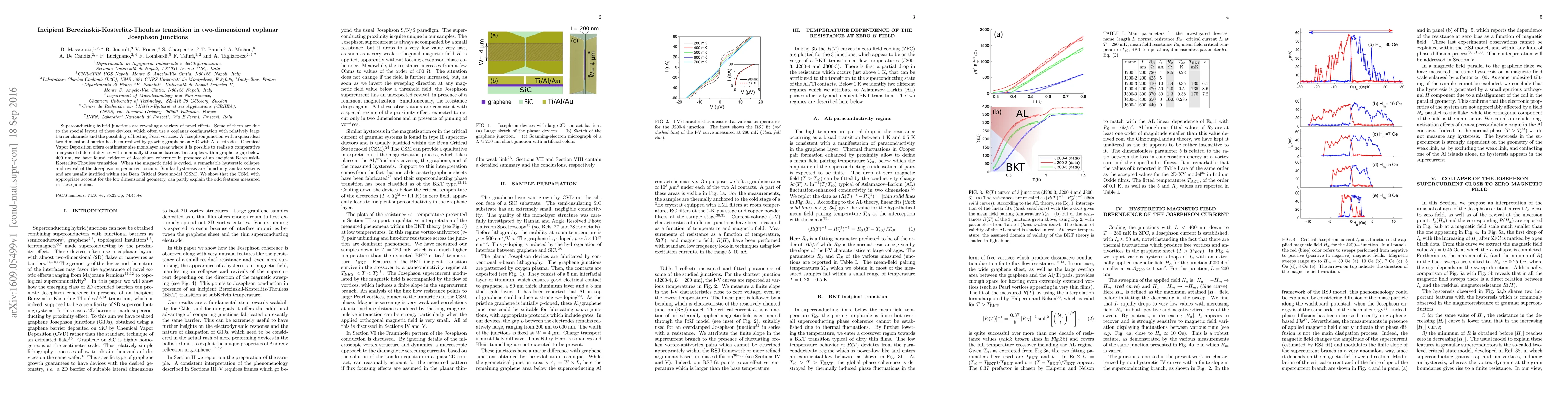 This paper investigates superconducting hybrid junctions with coplanar Josephson junctions, finding evidence of an incipient Berezinskii-Kosterlitz-Thouless transition in graphene-based junctions. The study reveals hysteretic behavior in Josephson supercurrent, which is partially explained using the Bean Critical State Model adapted for low-dimensional geometry.