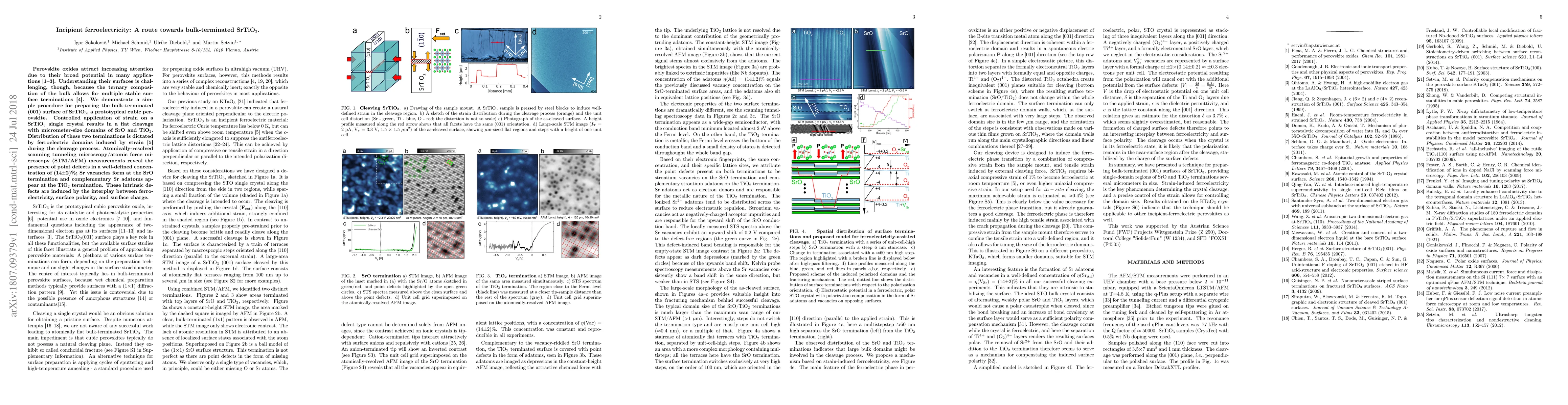 This paper presents a method to prepare the bulk-terminated (001) surface of SrTiO3, revealing micrometer-size domains of SrO and TiO2 through controlled strain application. Atomically-resolved microscopy shows intrinsic defects, including Sr vacancies and adatoms, driven by ferroelectricity and surface polarity.