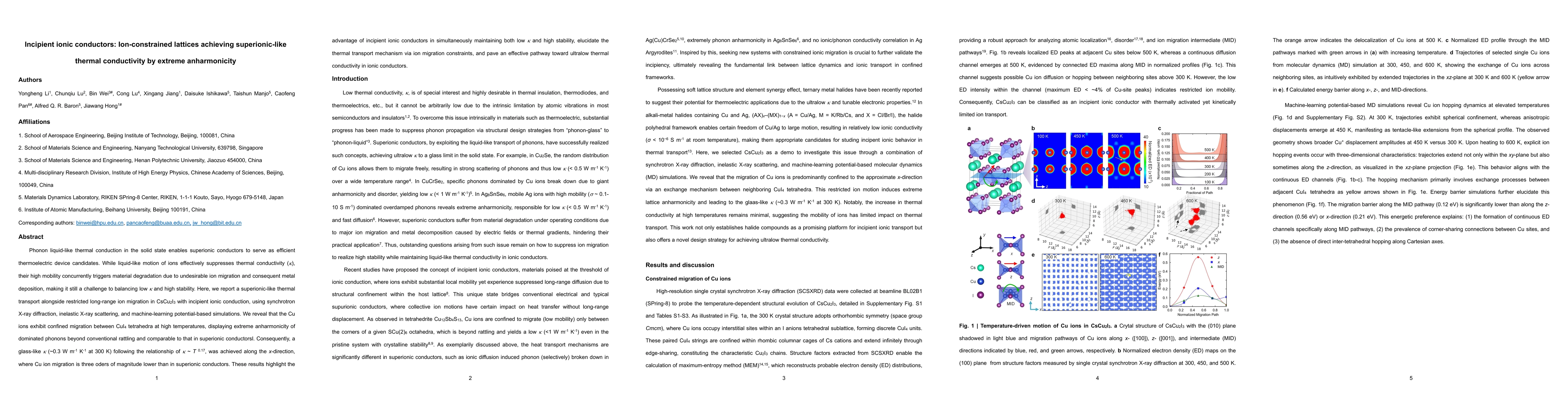 Phonon liquid-like thermal conduction in the solid state enables superionic conductors to serve as efficient thermoelectric device candidates. While liquid-like motion of ions effectively suppresses thermal conductivity (\kappa), their high mobility concurrently triggers material degradation due to undesirable ion migration and consequent metal deposition, making it still a challenge to balancing low \kappa and high stability. Here, we report a superionic-like thermal transport alongside restricted long-range ion migration in CsCu_2I_3 with incipient ionic conduction, using synchrotron X-ray diffraction, inelastic X-ray scattering, and machine-learning potential-based simulations. We reveal that the Cu ions exhibit confined migration between CuI_4 tetrahedra at high temperatures, displaying extreme anharmonicity of dominated phonons beyond conventional rattling and comparable to that in superionic conductorsl. Consequently, a glass-like \kappa (~0.3 W m^{-1} K^{-1} at 300 K) following the relationship of \kappa ~ T^{0.17}, was achieved along the x-direction, where Cu ion migration is three oders of magnitude lower than in superionic conductors. These results highlight the advantage of incipient ionic conductors in simultaneously maintaining both low \kappa and high stability, elucidate the thermal transport mechanism via ion migration constraints, and pave an effective pathway toward ultralow thermal conductivity in ionic conductors.