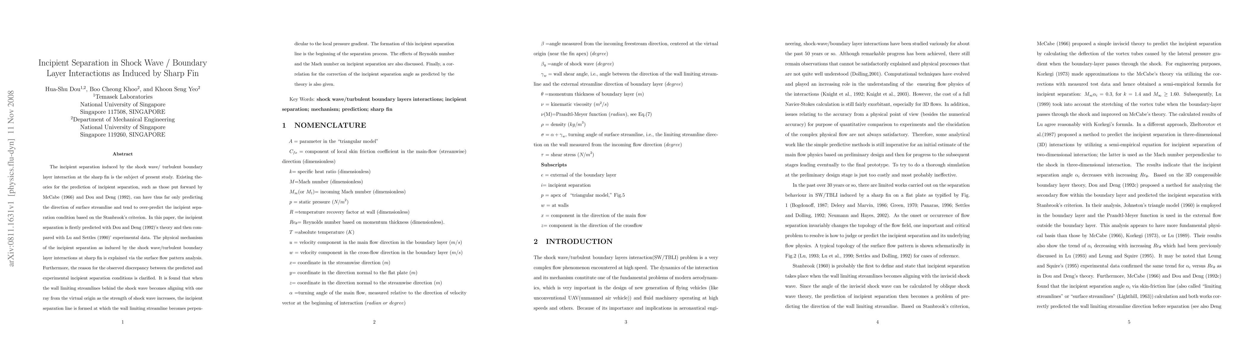 This research investigates the incipient separation in shock wave boundary layer interactions caused by a sharp fin. It compares Dou and Deng's (1992) theory predictions with Lu and Settles' (1990) experimental data, identifying discrepancies and explaining them through surface flow pattern analysis. The study finds that incipient separation occurs when wall limiting streamlines align with rays from a virtual origin due to increasing shock wave strength. It also discusses the effects of Reynolds and Mach numbers on incipient separation, providing a correlation for correcting predicted separation angles.
