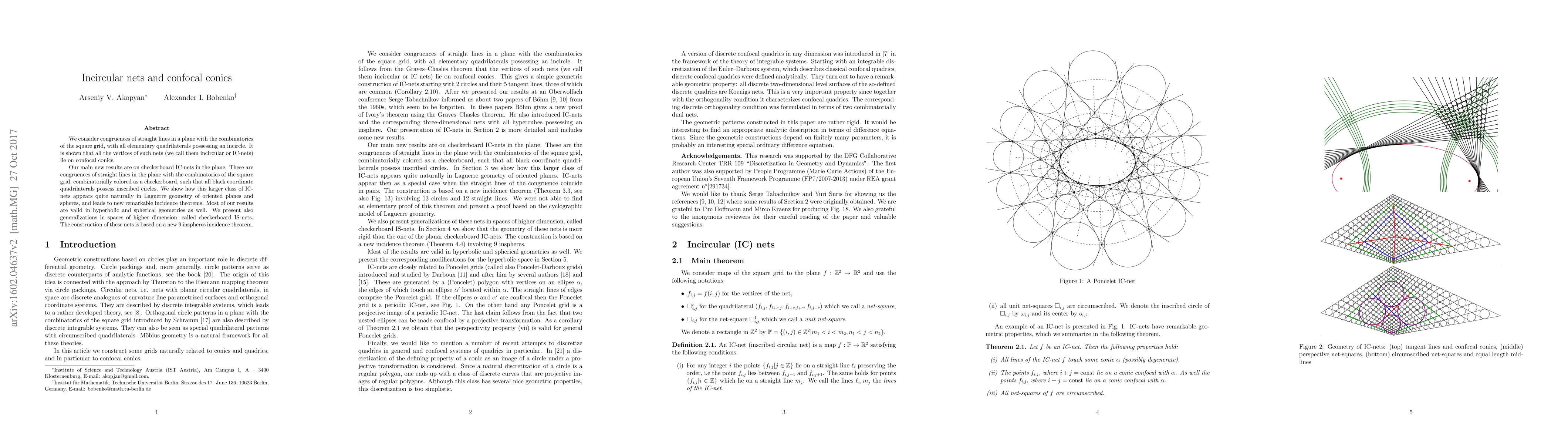 This paper explores the properties of incircular (IC) nets, which are congruences of straight lines in a plane with square grid combinatorics and incircles in all elementary quadrilaterals. The study reveals that the vertices of these IC-nets lie on confocal conics, with a focus on checkerboard IC-nets that naturally emerge in Laguerre geometry and lead to new incidence theorems, extending to hyperbolic, spherical, and higher-dimensional geometries.