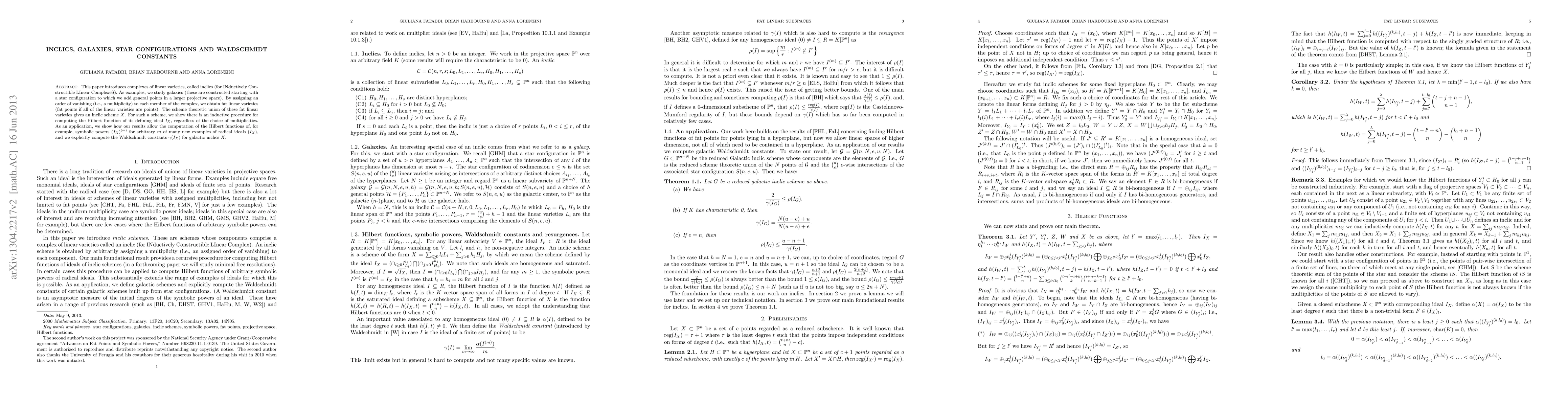 This paper introduces complexes of linear varieties, called inclics (for INductively Constructible LInear ComplexeS). As examples, we study galaxies (these are constructed starting with a star configuration to which we add general points in a larger projective space). By assigning an order of vanishing (i.e., a multiplicity) to each member of the complex, we obtain fat linear varieties (fat points if all of the linear varieties are points). The scheme theoretic union of these fat linear varieties gives an inclic scheme $X$. For such a scheme, we show there is an inductive procedure for computing the Hilbert function of its defining ideal $I_X$, regardless of the choice of multiplicities. As an application, we show how our results allow the computation of the Hilbert functions of, for example, symbolic powers $(I_X)^{(m)}$ for arbitrary $m$ of many new examples of radical ideals $(I_X)$, and we explicitly compute the Waldschmidt constants $\gamma(I_X)$ for galactic inclics $X$.