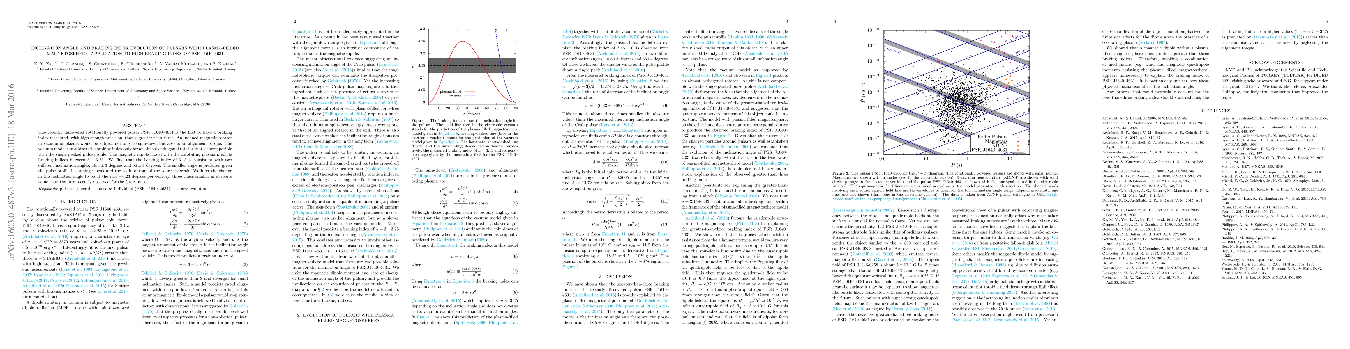 This paper investigates the braking index and inclination angle evolution of pulsars with plasma-filled magnetospheres, focusing on PSR J1640-4631, which has a high braking index exceeding three. The study suggests a preferred inclination angle of $18.5\pm 3$ degrees for the pulsar, based on its single-peaked pulse profile and weak radio output.