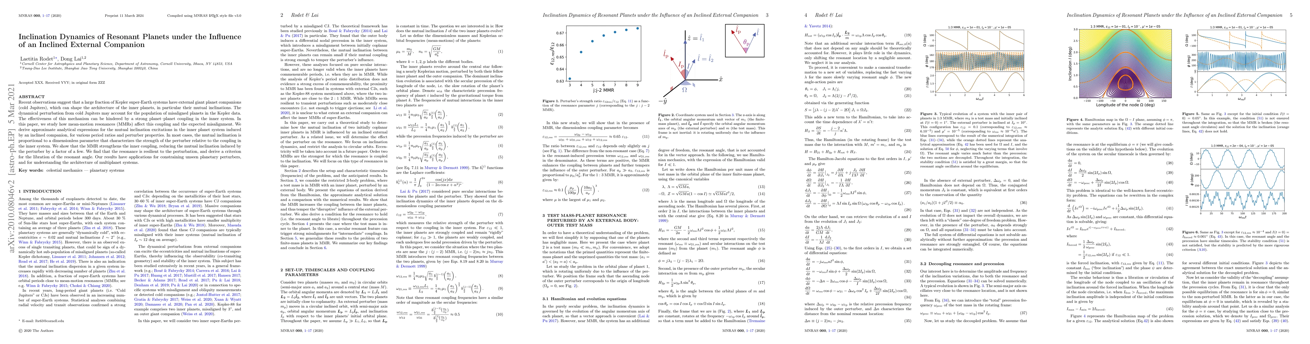 Recent observations suggest that a large fraction of Kepler super-Earth systems have external giant planet companions (cold Jupiters), which can shape the architecture of the inner planets, in particular their mutual inclinations. The dynamical perturbation from cold Jupiters may account for the population of misaligned planets in the Kepler data. The effectiveness of this mechanism can be hindered by a strong planet--planet coupling in the inner system. In this paper, we study how mean-motion resonances (MMRs) affect this coupling and the expected misalignment. We derive approximate analytical expressions for the mutual inclination excitations in the inner planet system induced by an inclined companion, for various period ratios and perturber properties. In most cases, the mutual inclination is proportional to a dimensionless parameter that characterizes the strength of the perturber relative to the coupling in the inner system. We show that the MMR strengthens the inner coupling, reducing the mutual inclination induced by the perturber by a factor of a few. We find that the resonance is resilient to the perturbation, and derive a criterion for the libration of the resonant angle. Our results have applications for constraining unseen planetary perturbers, and for understanding the architecture of multiplanet systems.