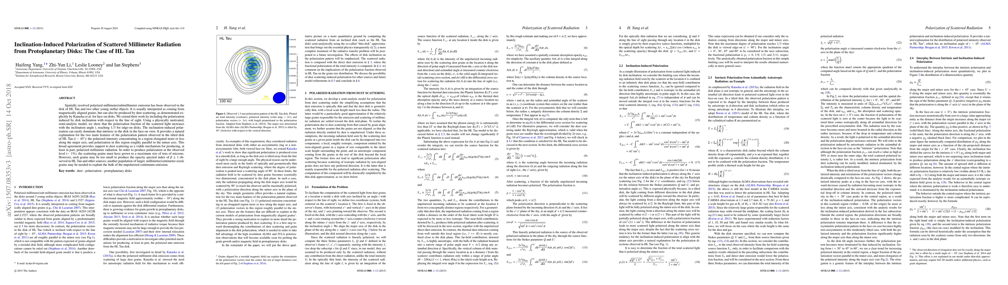 This paper investigates the polarization of scattered millimeter radiation in the protoplanetary disk of HL Tau, demonstrating that inclination-induced polarization can dominate over intrinsic polarization, especially for edge-on disks. The study suggests that dust scattering, rather than magnetic alignment, may partially account for the observed polarization, though larger grains may be needed for the unpolarized continuum emission.