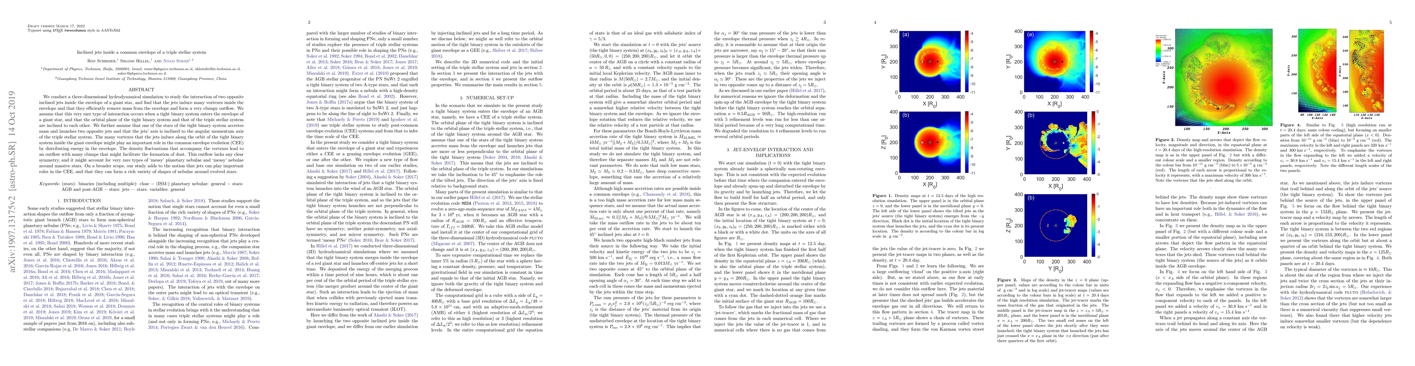 We conduct a three-dimensional hydrodynamical simulation to study the interaction of two opposite inclined jets inside the envelope of a giant star, and find that the jets induce many vortexes inside the envelope and that they efficiently remove mass from the envelope and form a very clumpy outflow. We assume that this very rare type of interaction occurs when a tight binary system enters the envelope of a giant star, and that the orbital plane of the tight binary system and that of the triple stellar system are inclined to each other. We further assume that one of the stars of the tight binary system accretes mass and launches two opposite jets and that the jets' axis is inclined to the angular momentum axis of the triple stellar system. The many vortexes that the jets induce along the orbit of the tight binary system inside the giant envelope might play an important role in the common envelope evolution (CEE) by distributing energy in the envelope. The density fluctuations that accompany the vortexes lead to an outflow with many clumps that might facilitate the formation of dust. This outflow lacks any clear symmetry, and it might account for very rare types of `messy' planetary nebulae and `messy' nebulae around massive stars. On a broader scope, our study adds to the notion that jets can play important roles in the CEE, and that they can form a rich variety of shapes of nebulae around evolved stars.