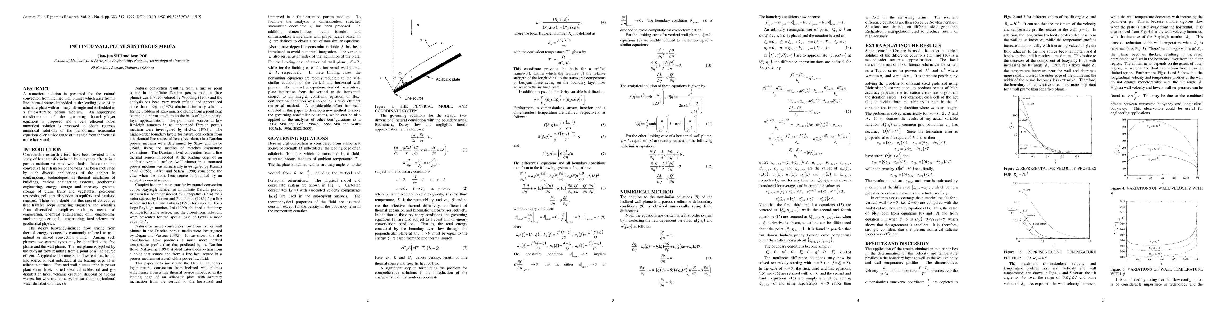 A numerical solution is presented for the natural convection from inclined wall plumes which arise from a line thermal source imbedded at the leading edge of an adiabatic plate with arbitrary tilt angle and embedded in a fluid-saturated porous medium. An appropriate transformation of the governing boundary-layer equations is proposed and a very efficient novel numerical solution is proposed to obtain rigorous numerical solutions of the transformed nonsimilar equations over a wide range of tilt angle from the vertical to the horizontal.