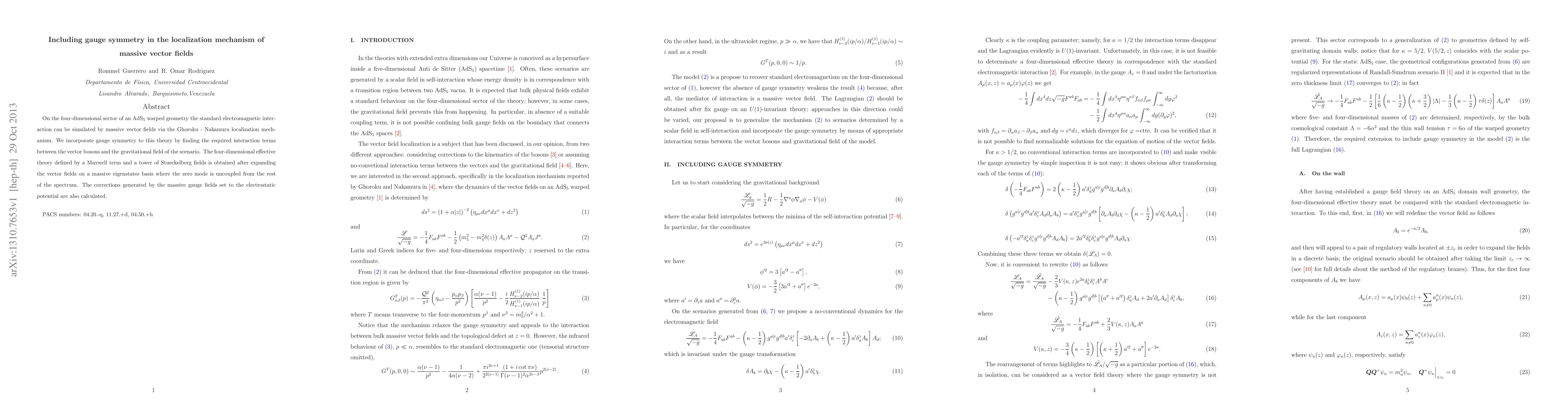 On the four-dimensional sector of an AdS$_5$ warped geometry the standard electromagnetic interaction can be simulated by massive vector fields via the Ghoroku - Nakamura localization mechanism. We incorporate gauge symmetry to this theory by finding the required interaction terms between the vector bosons and the gravitational field of the scenario. The four-dimensional effective theory defined by a Maxwell term and a tower of Stueckelberg fields is obtained after expanding the vector fields on a massive eigenstates basis where the zero mode is uncoupled from the rest of the spectrum. The corrections generated by the massive gauge fields set to the electrostatic potential are also calculated.