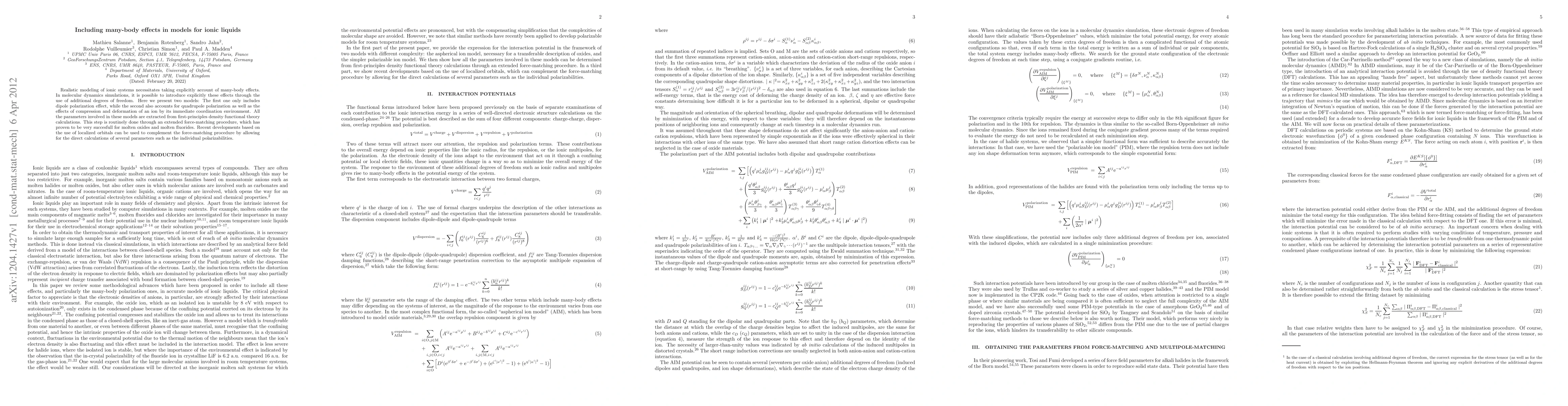 Realistic modeling of ionic systems necessitates taking explicitly account of many-body effects. In molecular dynamics simulations, it is possible to introduce explicitly these effects through the use of additional degrees of freedom. Here we present two models: The first one only includes dipole polarization effect, while the second also accounts for quadrupole polarization as well as the effects of compression and deformation of an ion by its immediate coordination environment. All the parameters involved in these models are extracted from first-principles density functional theory calculations. This step is routinely done through an extended force-matching procedure, which has proven to be very succesfull for molten oxides and molten fluorides. Recent developments based on the use of localized orbitals can be used to complement the force-matching procedure by allowing for the direct calculations of several parameters such as the individual polarizabilities.